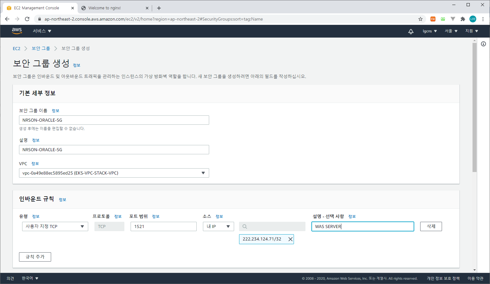 Amazon RDS (Oracle)에서 사용할 보안 그룹을 구성한다. Oracle에서 자주 사용하는 Default Port인 1521 포트를 인바운드로 오픈할 소스를 지정하여 보안그룹을 생성한다.