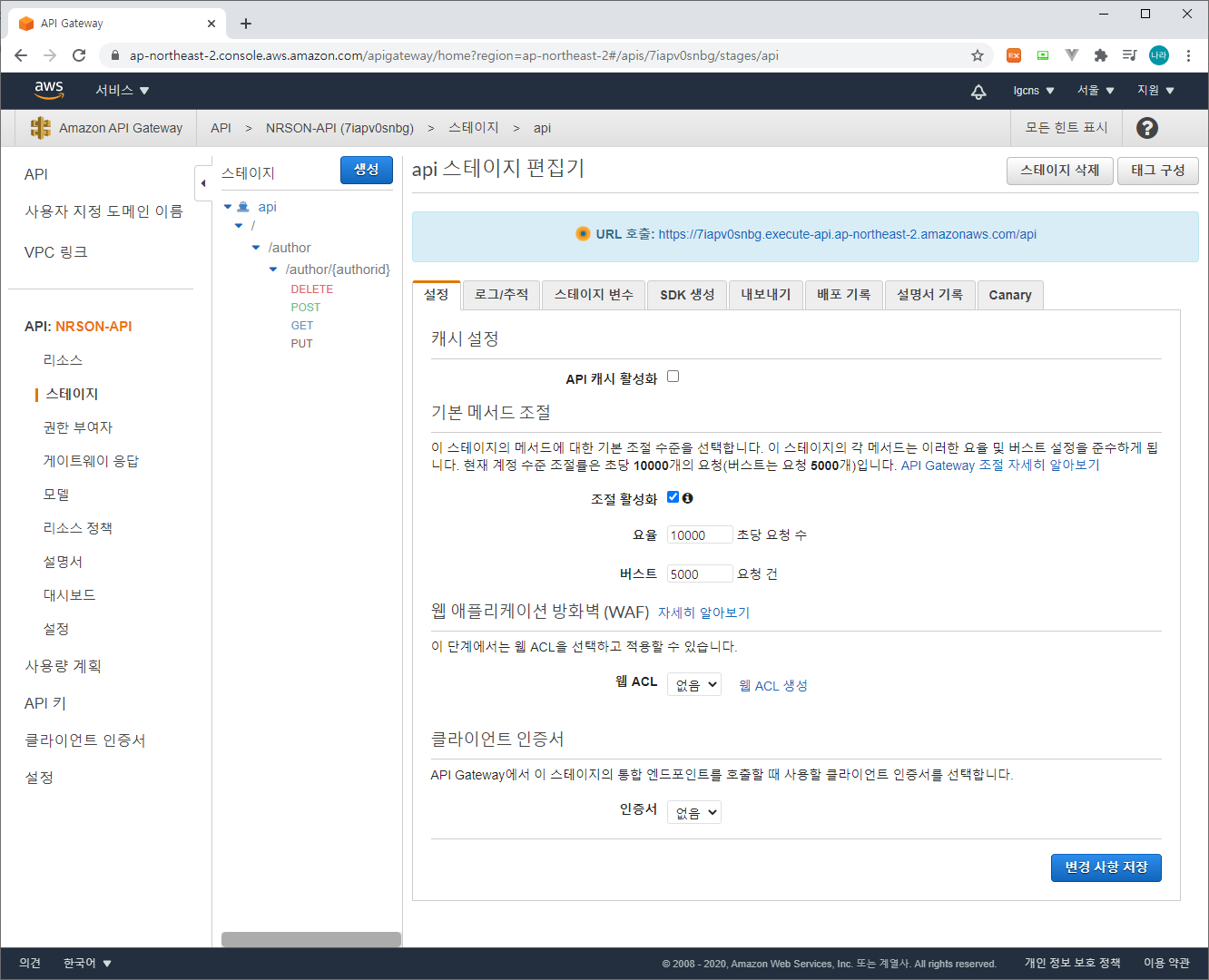 Amazon Cognito에서 사용자 인증/인가에 사용할 URL(https://nrson-api.auth.ap-northeast-2.amazoncognito.com) 검증을 진행한 후 변경 내용을 저장한다.