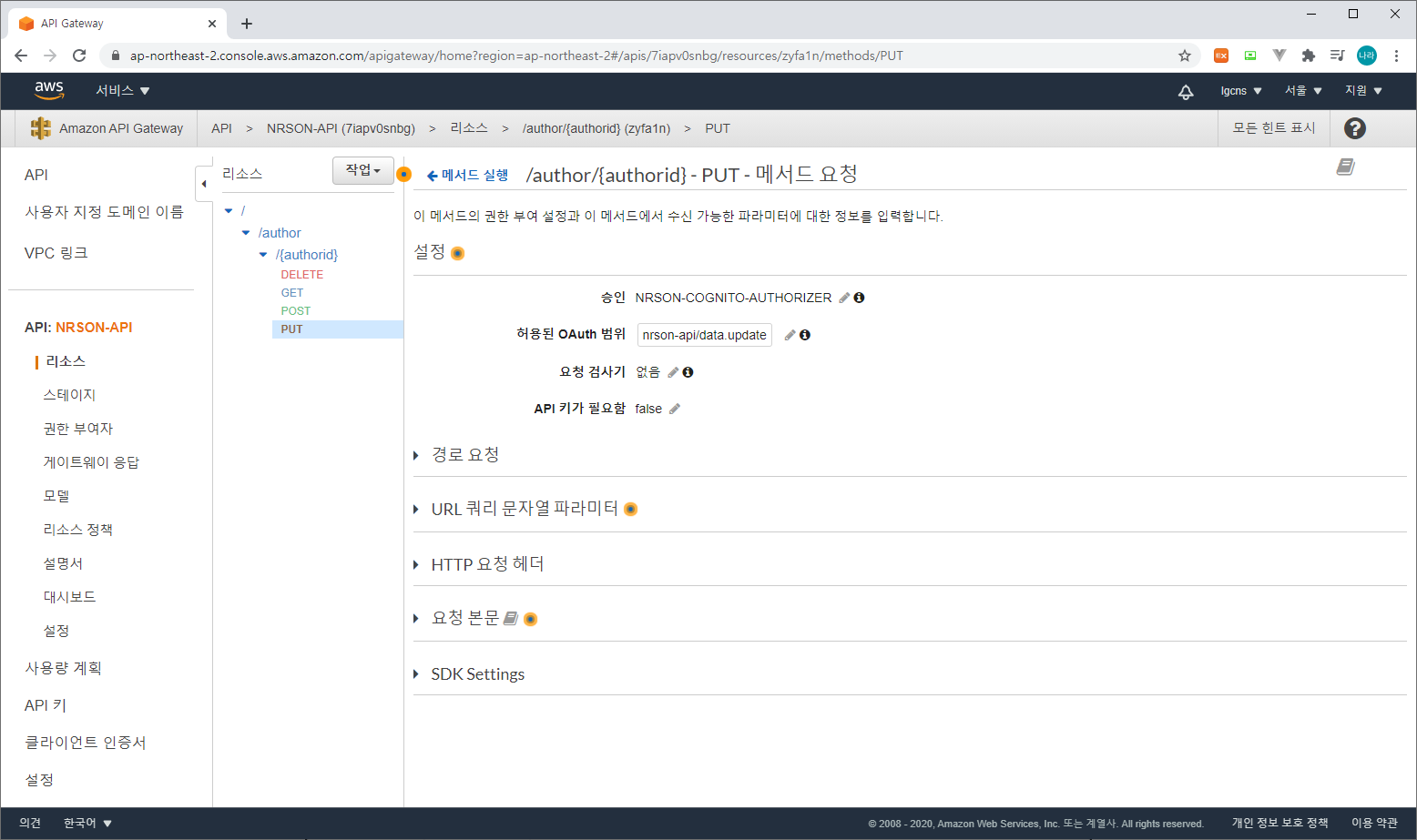 각각의 API HTTP Method는 Cognito에 정의한 사용자 풀을 권한 부여자로 등록하고 리소스 Scope을 API 별로 등록하여 해당 api를 사용할 수 있는지 여부를 검증하도록 설계한다.