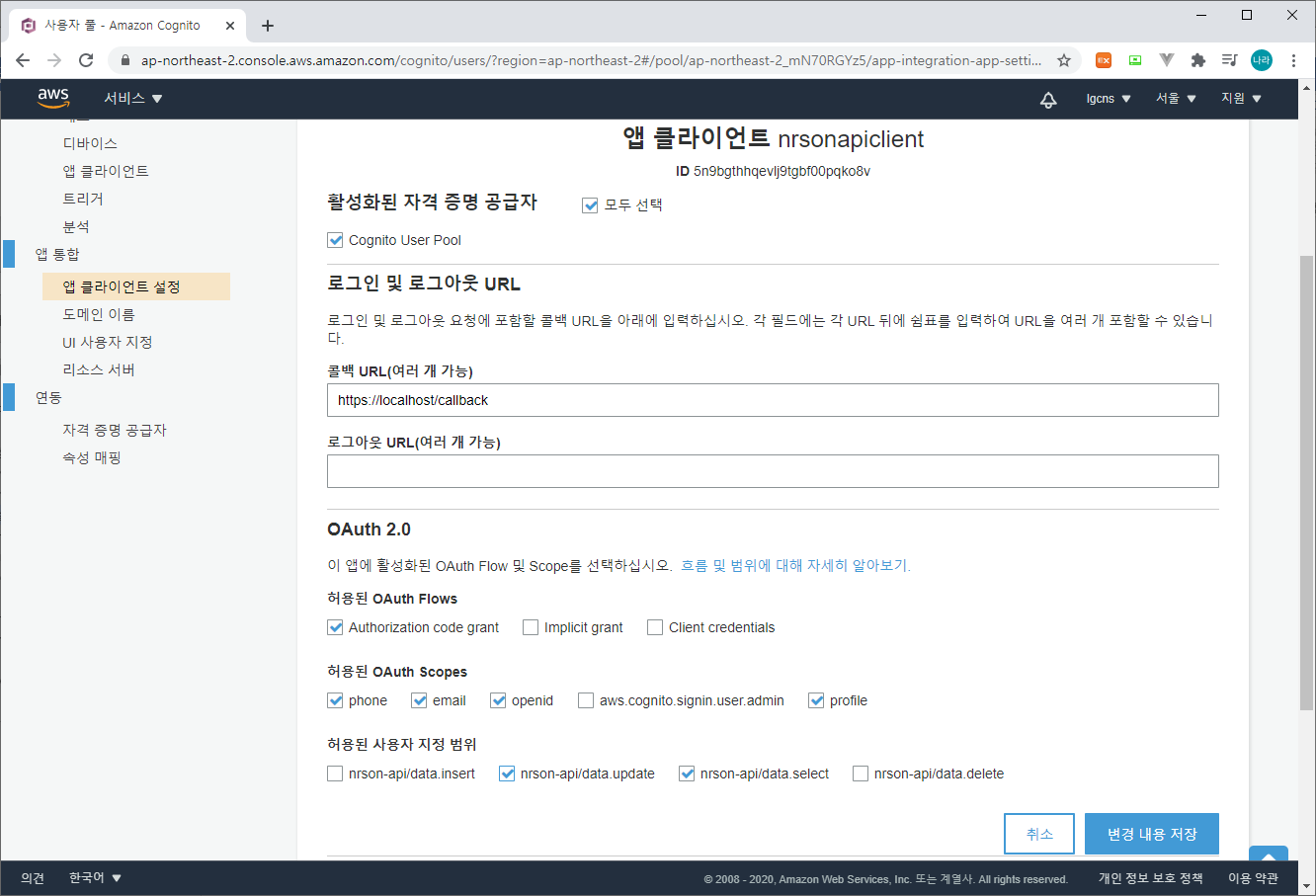 권한을 부여할 Scope을 지정하며, 기본 OAuth Scope으로 phone, email, openid, aws.cognito.signin.user.admin, profile이 있으며, 허용된 사용자 지정 범위는 실제 API에 대한 매핑 정보를 선택한다. 예를 들어 해당 앱 클라이언트 ID, 보안키를 사용하는 앱 클라이언트는 nrson-api/data.update, nrson-api/data.select에 대한 Scope을 허용하고, nrson-api/data.insert, nrson-api/data.delete는 허용하지 않는다.