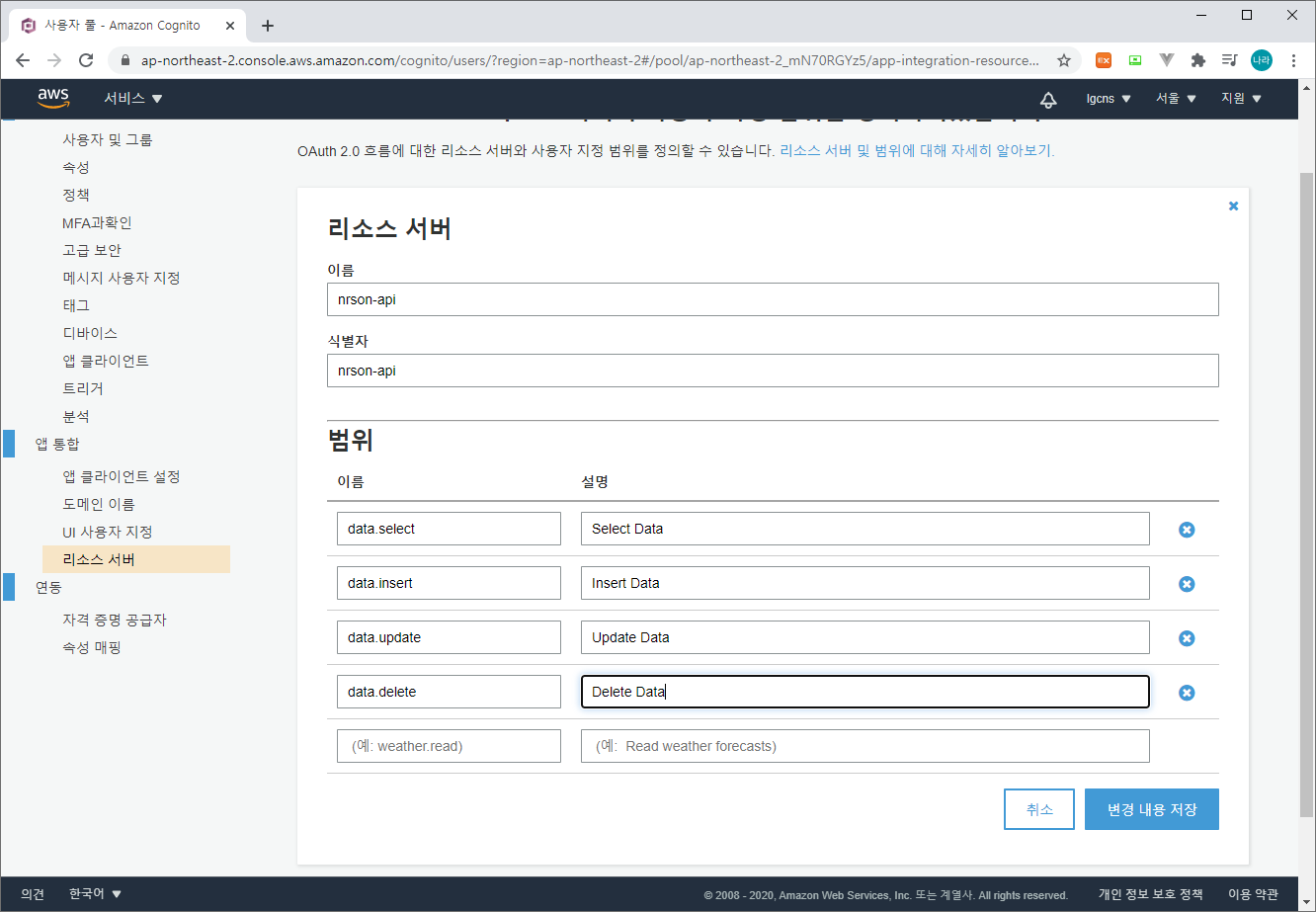 리소스 서버는 nrson-api/data.select, nrson-api/data.insert, nrson-api/data.update, nrson-api/data.delete 형태로 API Scope을 정의할 수 있다. Scope은 API 승인 및 허용된 OAuth 범위 지정에 매핑되어 API 접근 권한을 부여한다. 이는 사용자 풀의 앱 클라이언트 설정에 허용된 Scope을 통해 API 접근 권한이 관리된다.