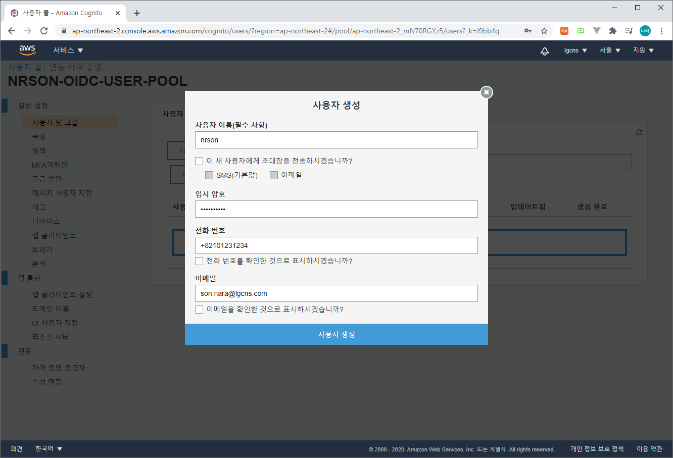 현재는 테스트 용도로 직접 사용자를 위와 같이 등록하지만, 실제로는 사용자 가입 등이 이루어 질때 Cognito의 Admin API를 호출하여 직접 사용자를 등록하는 로직까지 포함되어 동작하도록 개발해야 한다.