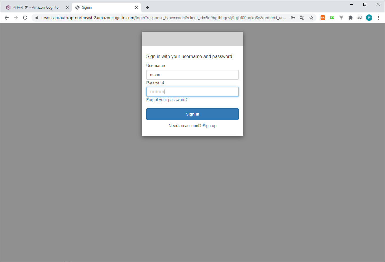 위와 같이 호출하면, Cognito에 등록된 사용자 정보를 기반으로 로그인 인증을 수행한다.