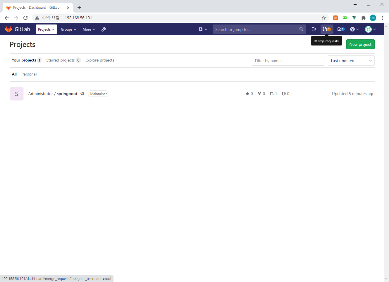 Merge Request가 생성되면, 다음으로 Maintainer의 권한이 부여되어 있는 root로 로그인한다. root로 로그인하면 상단 오른쪽 메뉴바 상태장에 Merge requests에 요청이 들어 온것을 확인할 수 있다.