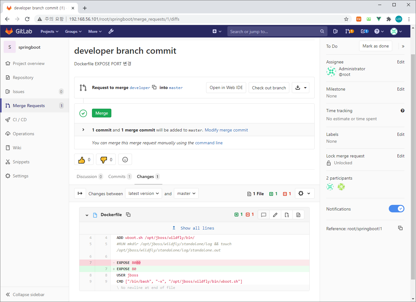 앞서 Developer Branch에 Commit한 EXPOSE PORT 정보를 확인할 수 있다. Merge를 승인하는 Maintainer는 해당 정보를 확인하고 승인 여부를 결정한다. 위와 같이 Maintainer는 코드를 리뷰하고 전체 업무 프로세스를 명확히 이해하고 있는 리더가 담당해야하며, 직접 개발을 할수도 있겠지만, 사실 개발을 할 시간이 없을 정도로 코드 리뷰와 Merge 관리만으로 엄청난 업무량을 기대할 수 있을 것이다. Commit 정보를 확인하고 해당 정보를 승인하기 위해서는 Merge 버튼을 클릭한다.