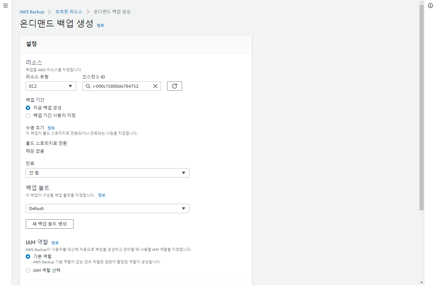 * 리소스 : 리소스 유형은 EC2 / 백업할 EC2 인스턴스 ID를 선택한다.