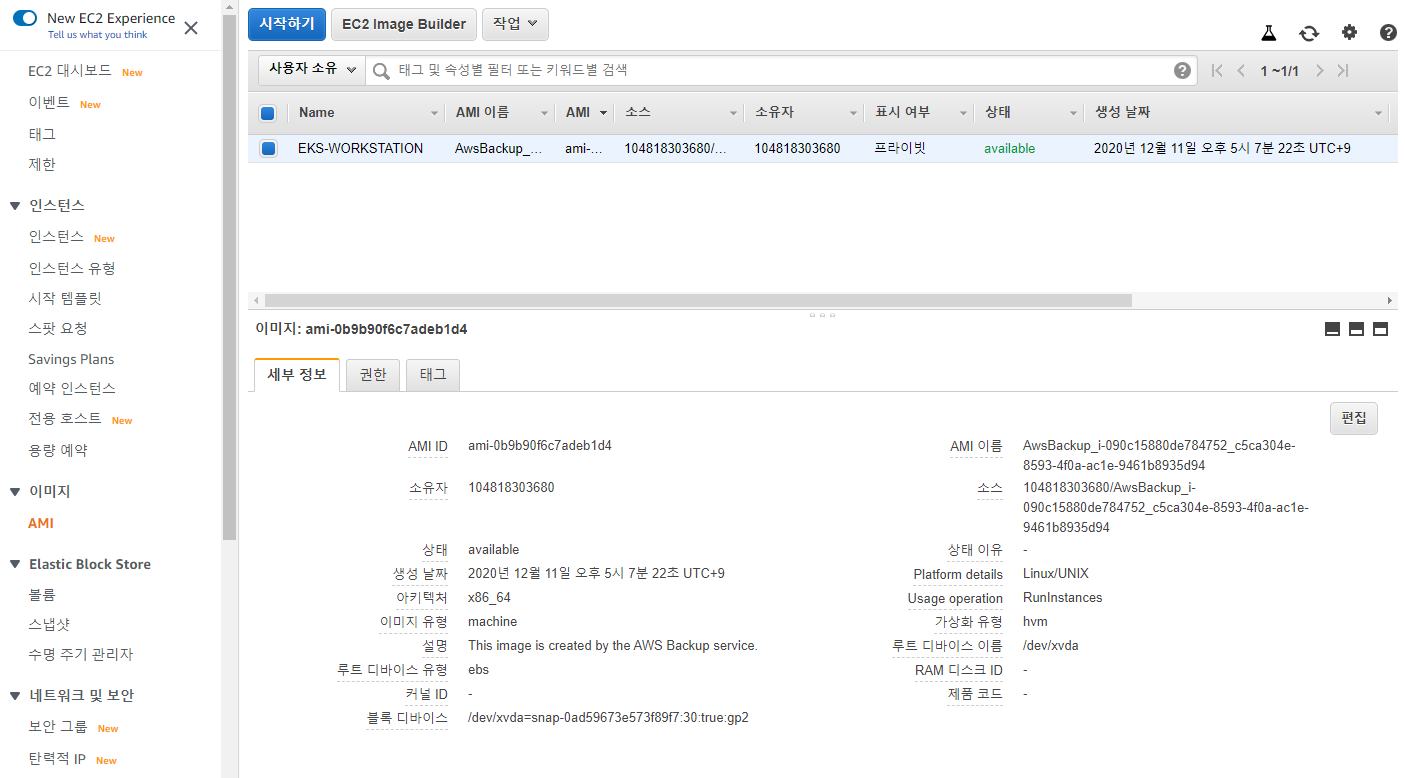 위와 같이 EC2 백업을 생성하는 동안 일정 시간이 소요된다. 백업이 완료되면 다음과 같이 AMI와 스냅샷이 생성된다.
