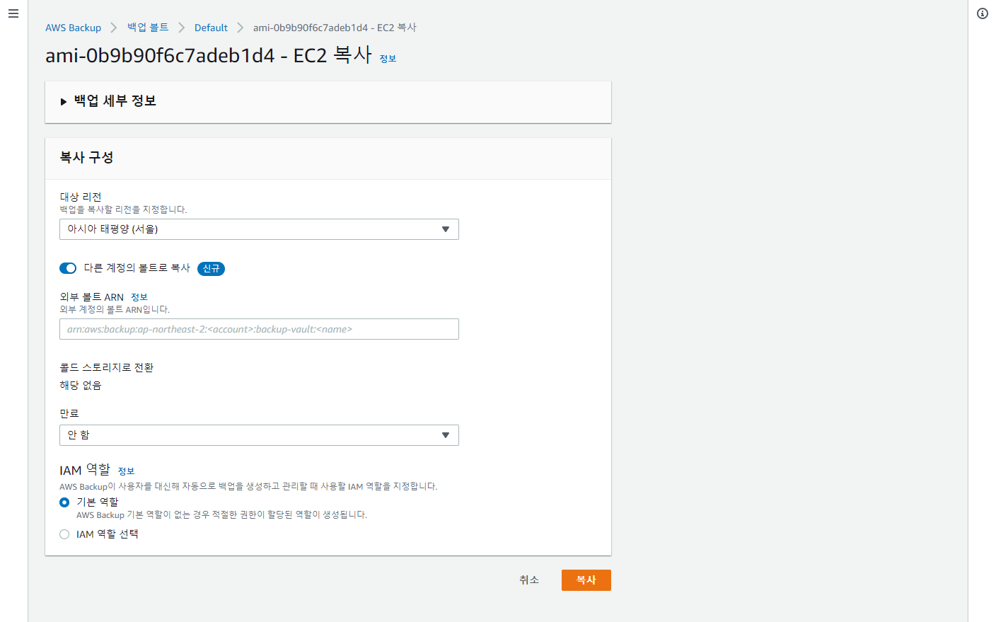 위와 같이 간단하게 복사하고자 하는 리전을 선택하고, 다른 계정을 사용할 경우 계정의 외부 볼트 ARN을 입력하여 이미지를 복사할 수 있다.