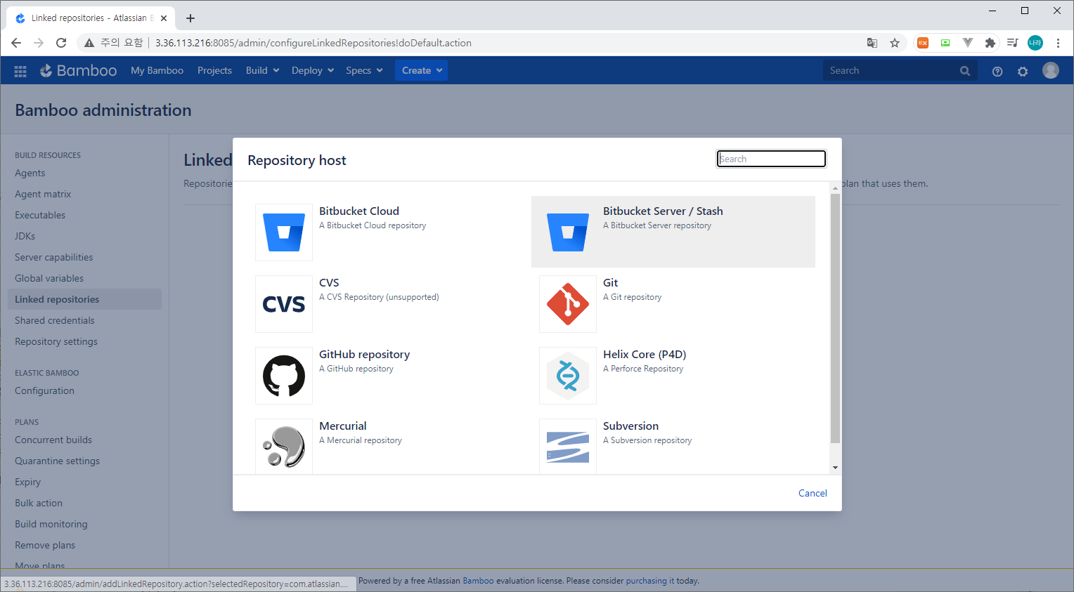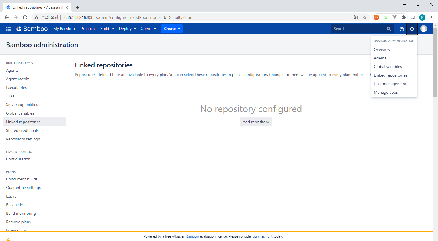 다양한 소스 형상관리 도구와 Bamboo를 연결하여 사용할 수 있지만, Atlassian 계열의 Bitbucket과 Bamboo를 연결하여 구성해 보도록 하자. Bitbucket과 Bamboo를 연결하기 위해서 각각 Application Link를 등록해야 한다.