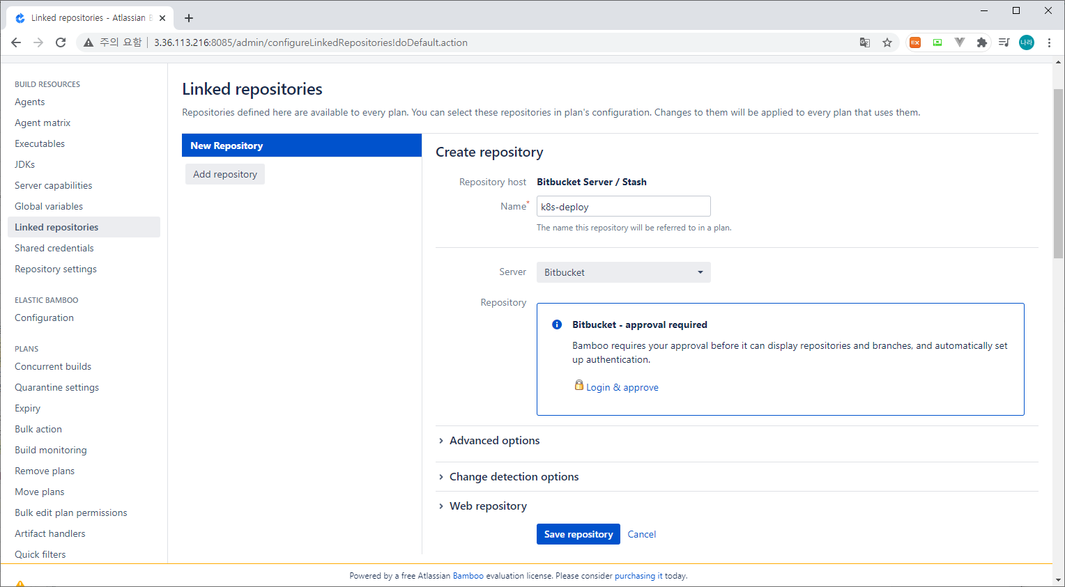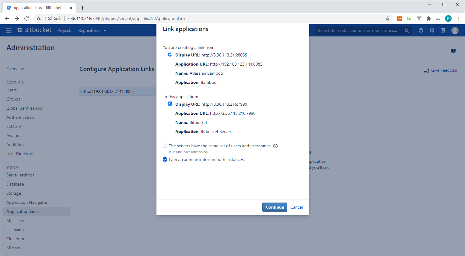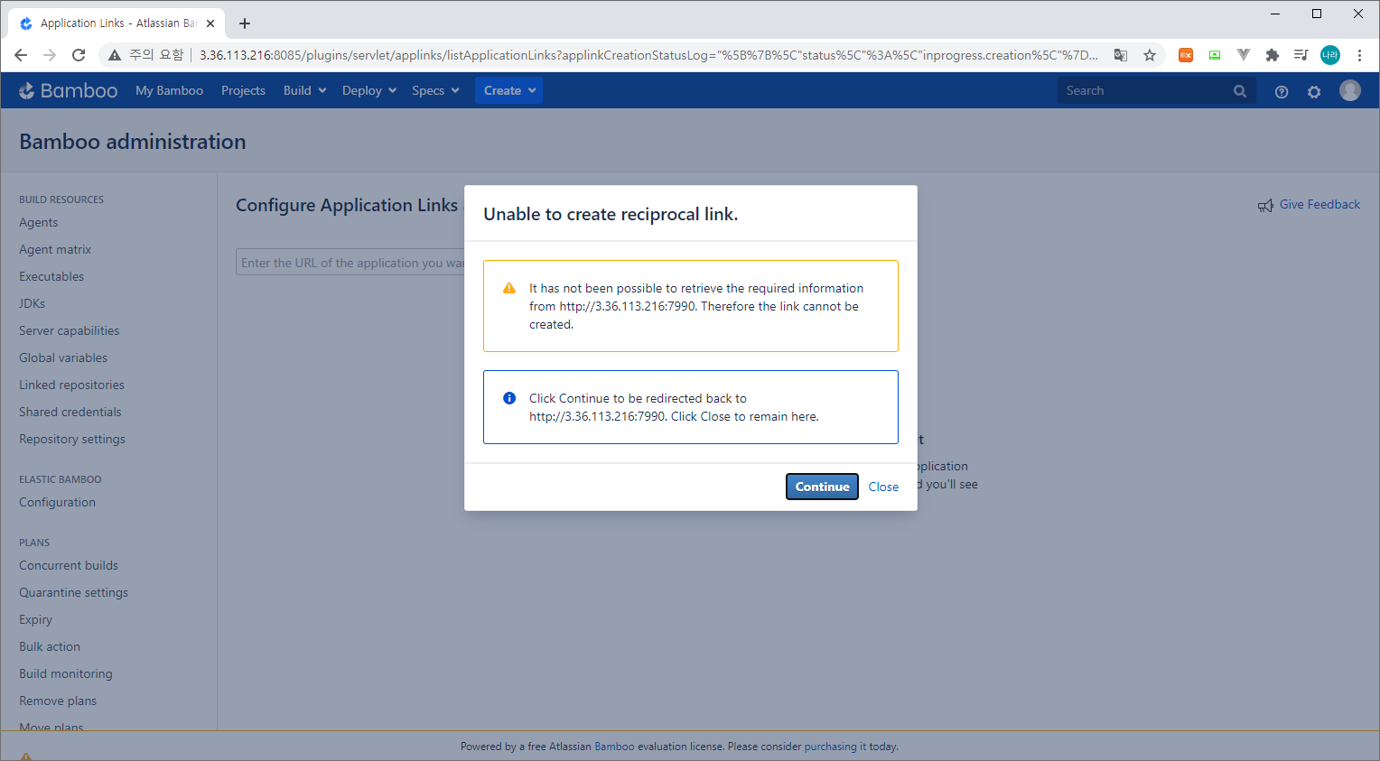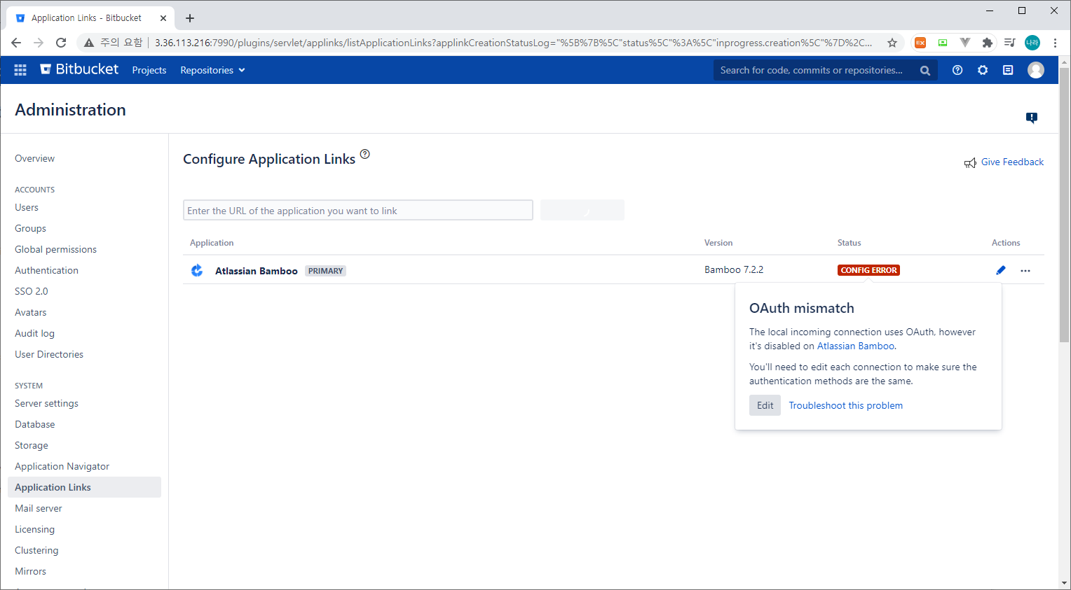 위와 같이 Bitbucket의 Application Link 만으로는 연결을 완료할 수 없다. Bamboo 역시 Bitbucket에 대한 Application Link를 생성하고 등록해 주어야 한다.