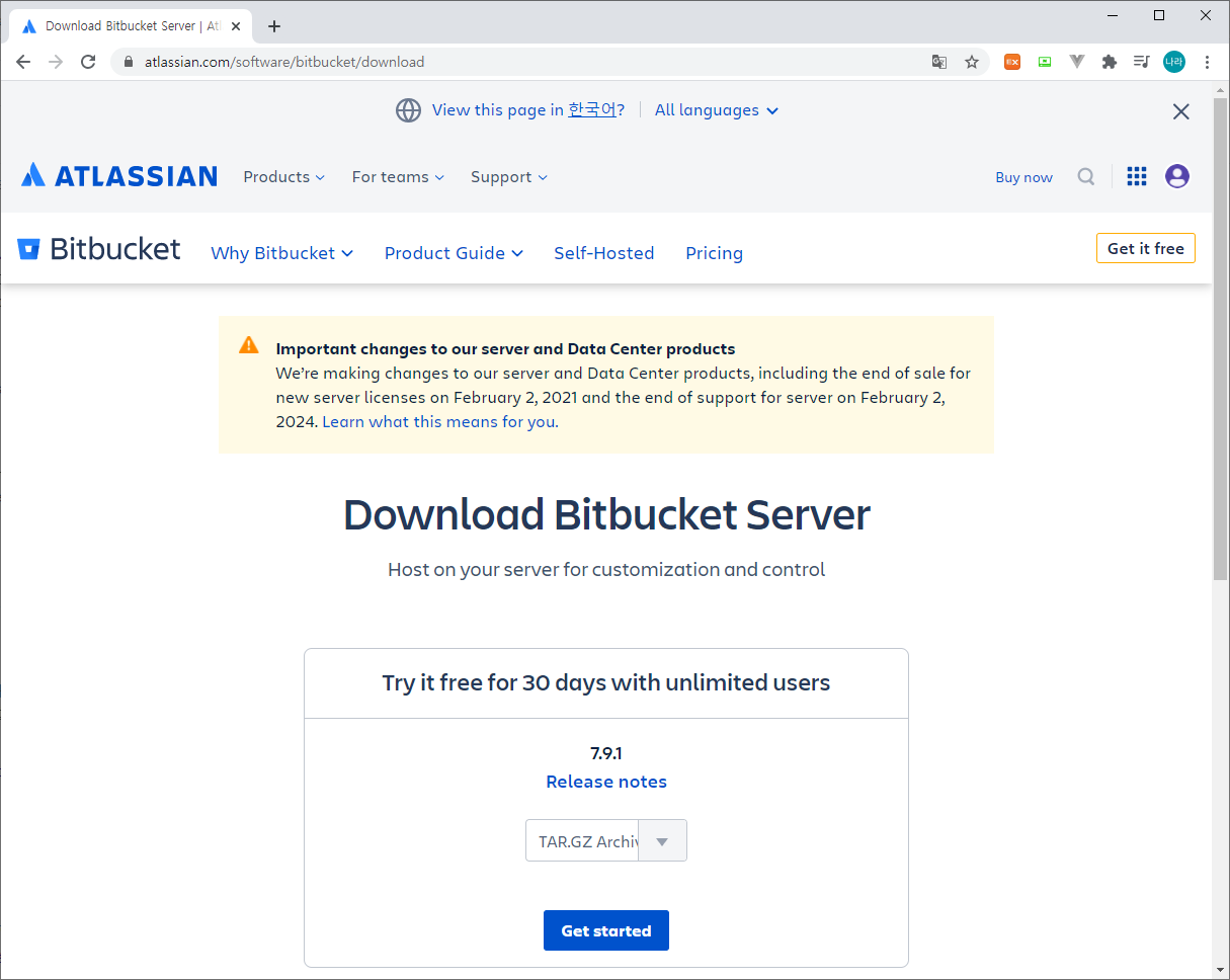 Bitbucket Server를 설치하기 위해 다운로드 사이트에 접속한다. (https://www.atlassian.com/software/bitbucket/download)
