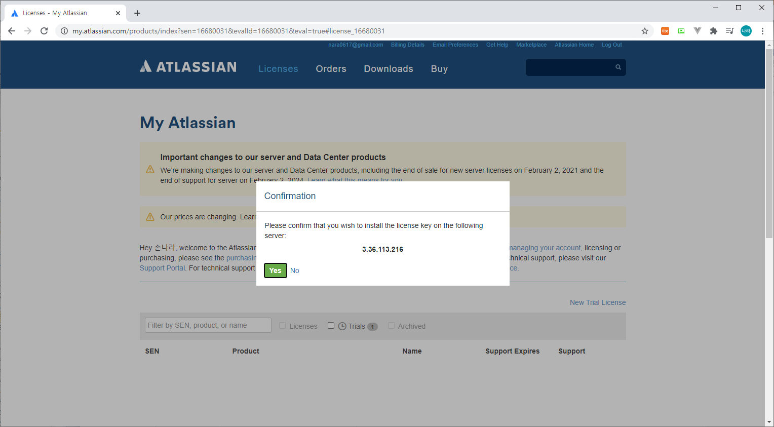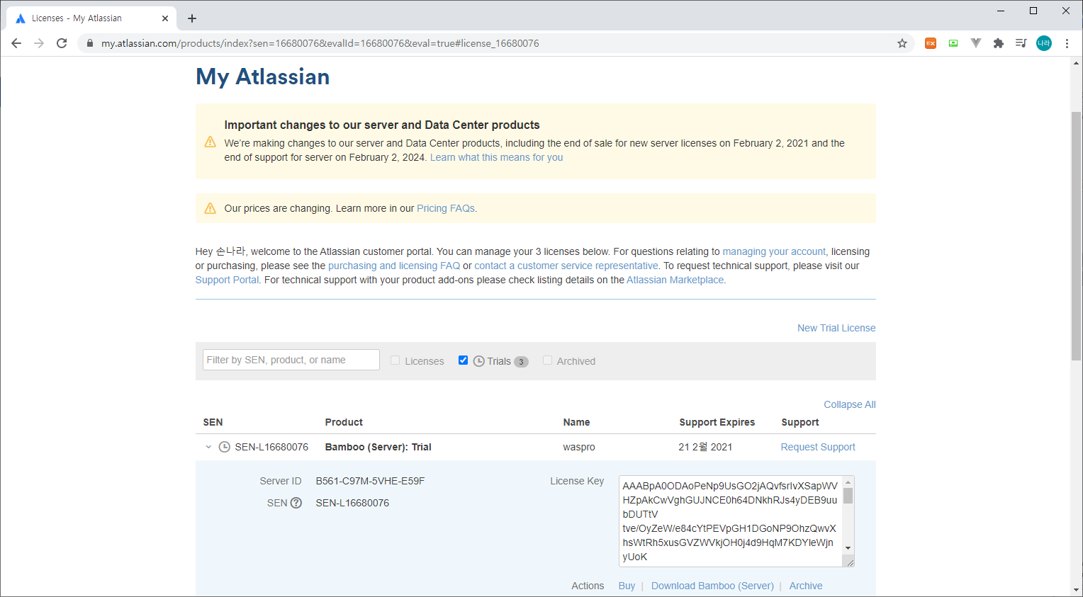 - 발급이 완료되면, 자동으로 라이센스 파일 적용 됨