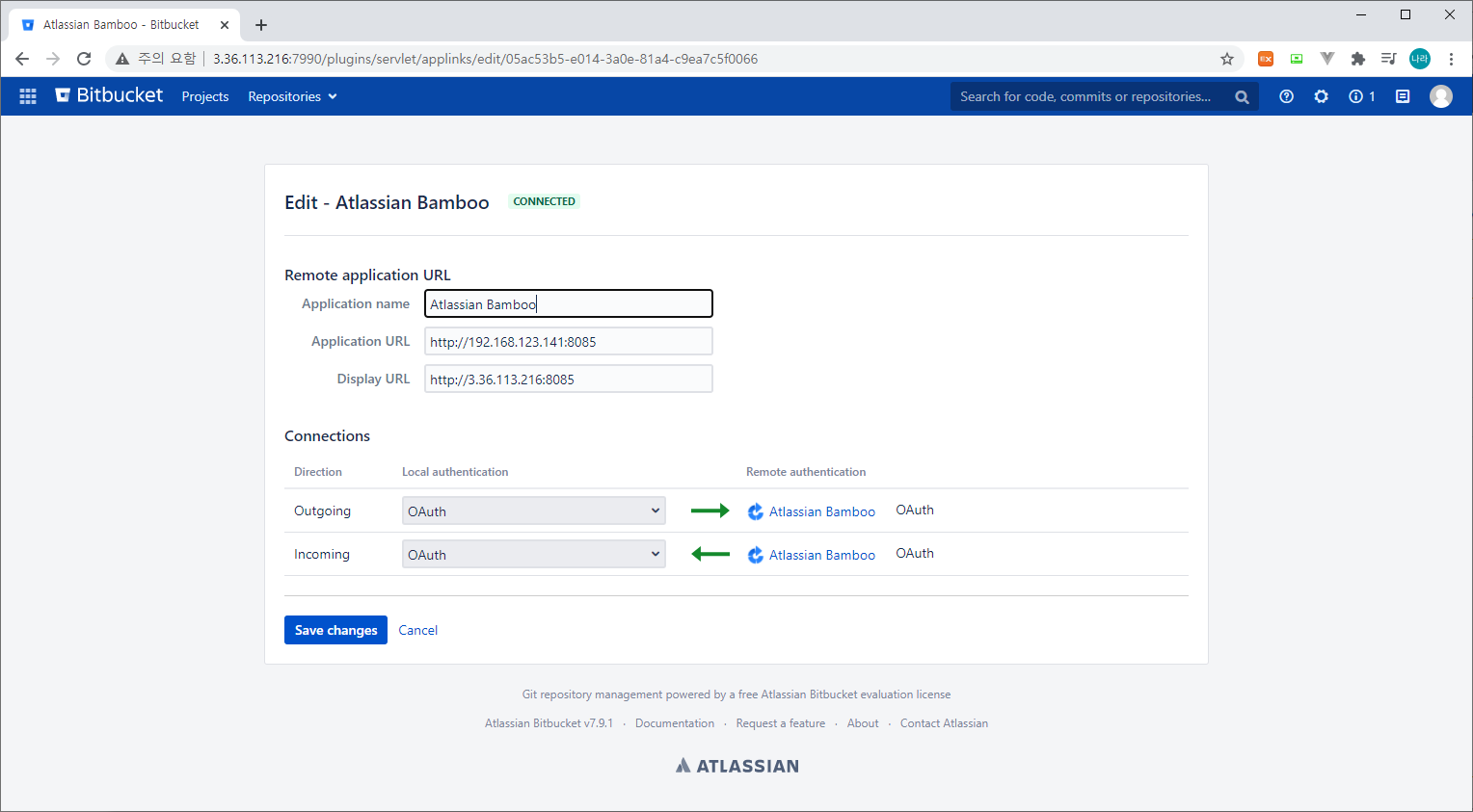 각각 Bitbucket과 Bamboo의 Outgoing/Incoming Authentication 방식을 OAuth로 변경 후 Save Chages를 선택한다. 인증설정이 완료되면, 다음과 같이 CONNECTED 상태로 변경되는 것을 확인할 수 있을 것이다.