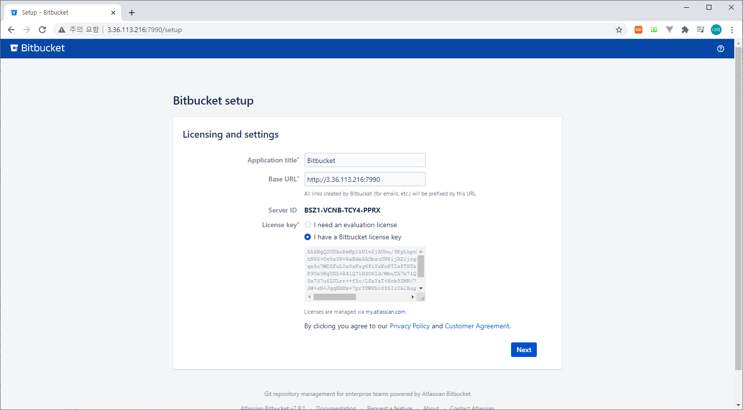 - Licensing and settings : License 발급을 위해 Server ID 저장, License Key - I need an evaluation license 선택하면 자동으로 라이센스 발급 페이지로 이동 됨