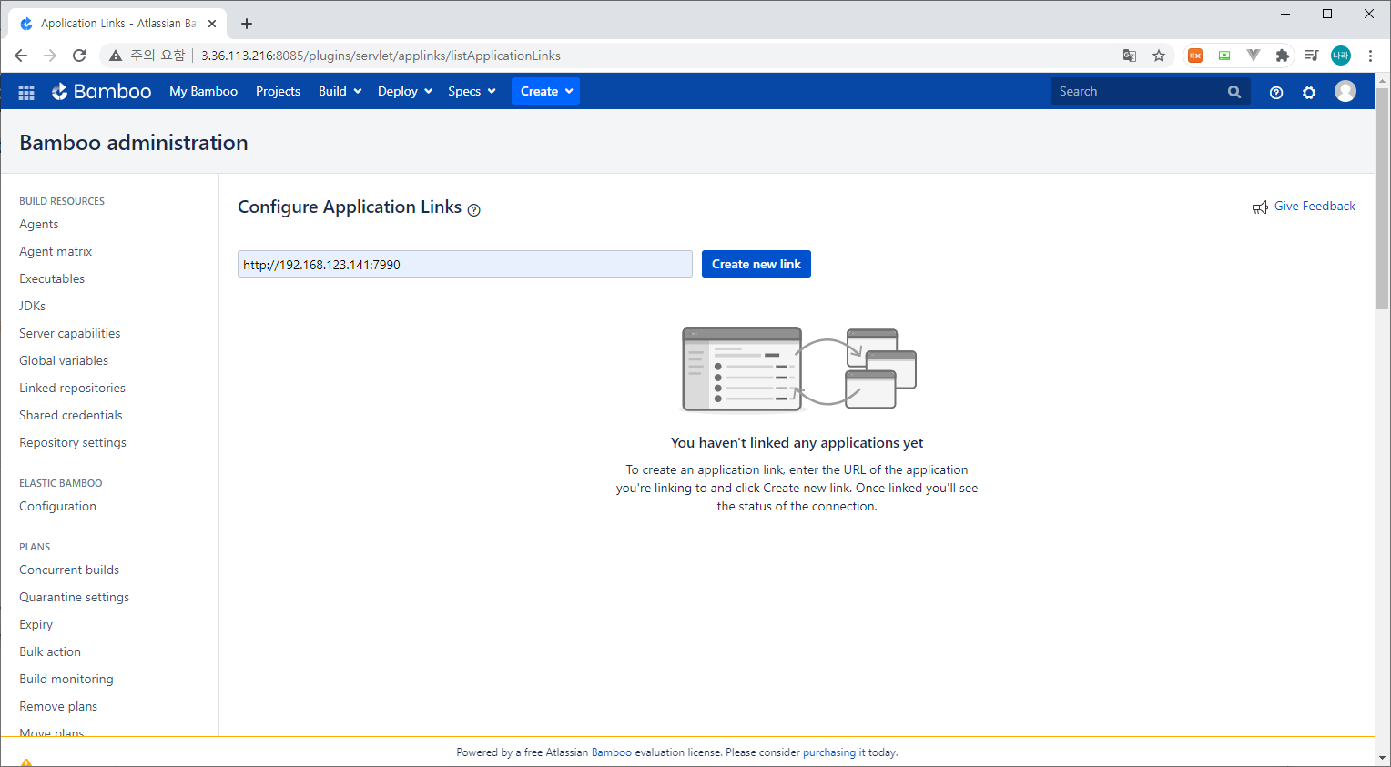 Configure Application Links에 Bamboo URL을 입력하고 Create new link를 선택한다.