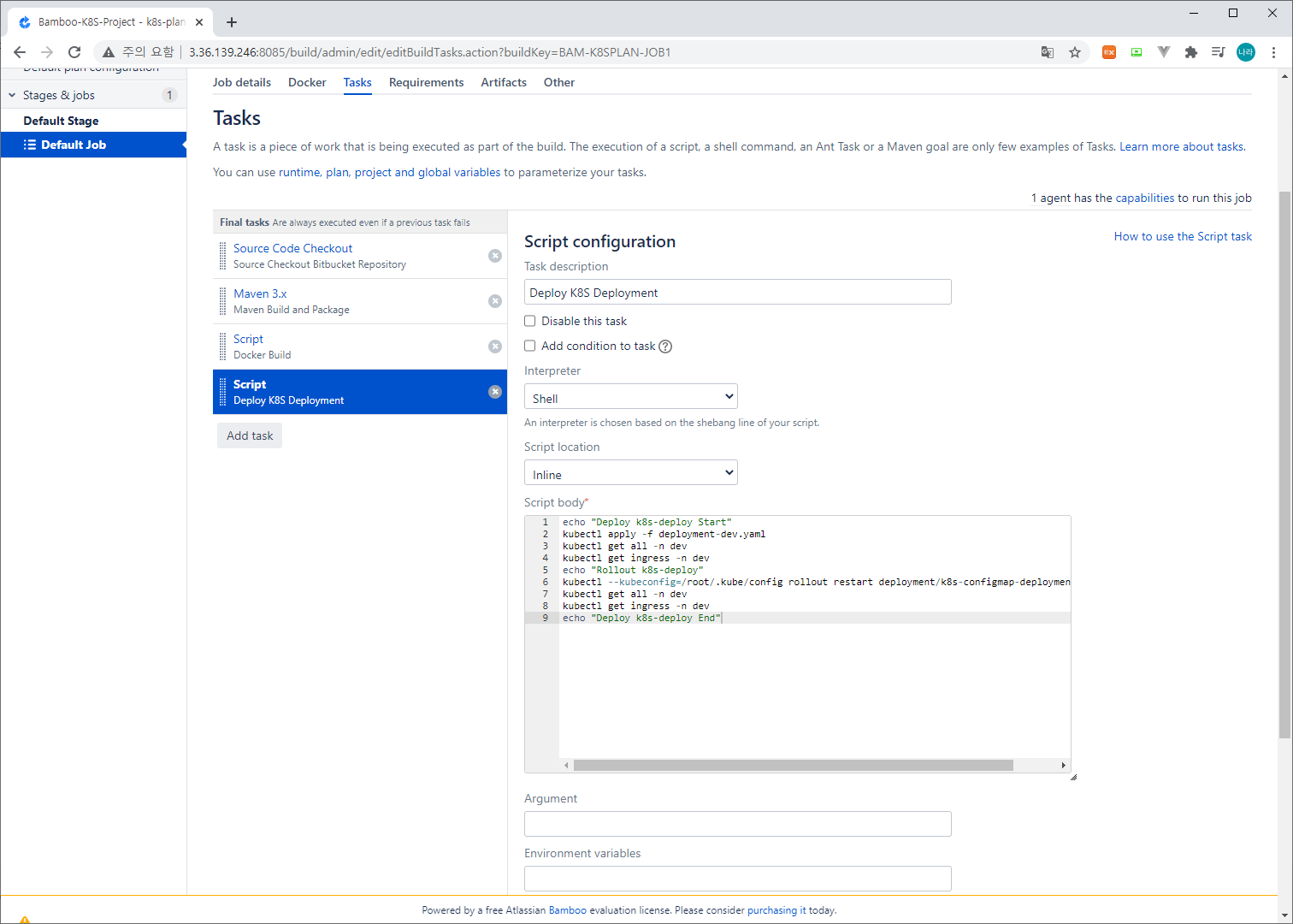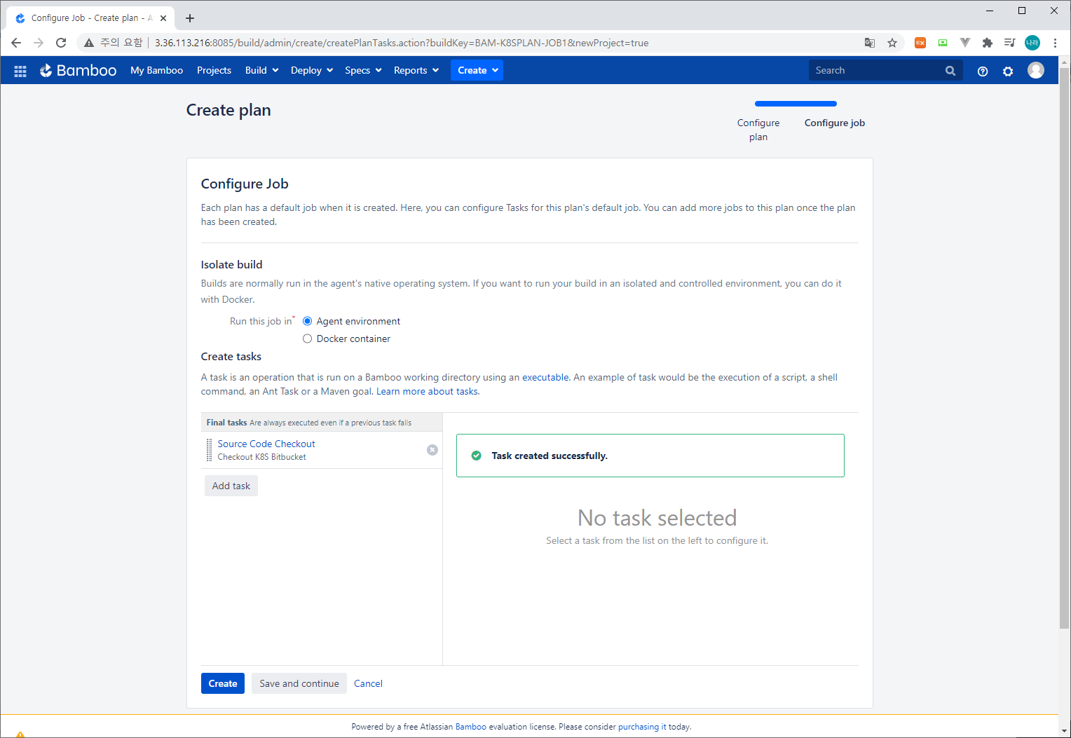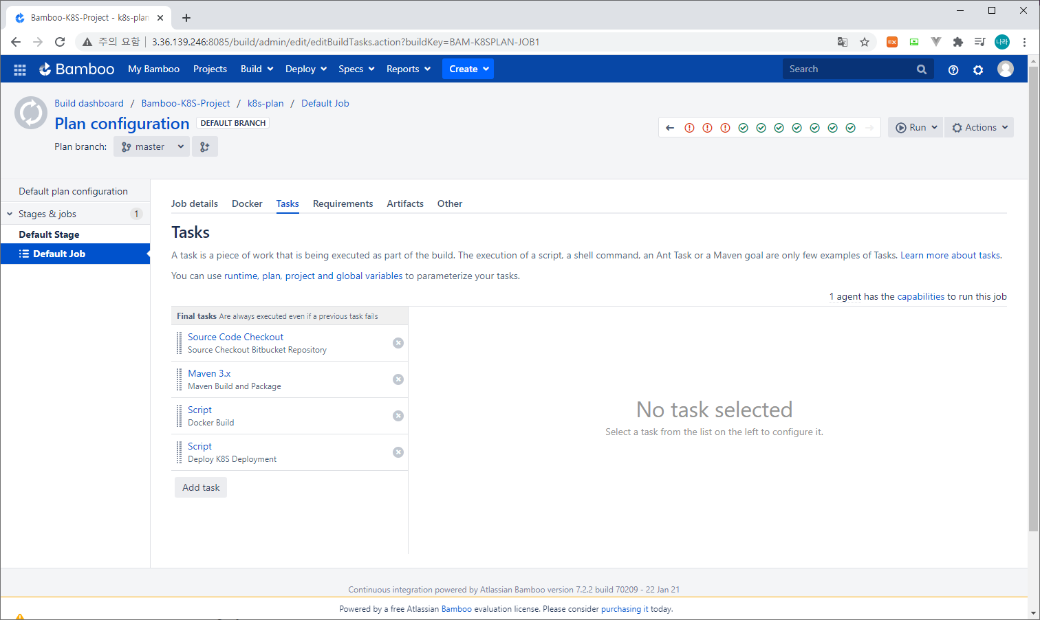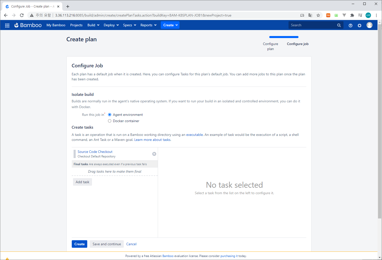 - Isolate build - Run this job in : Agent environment (Bamboo Server 자체적으로 실행할지 또는 Docker Container를 기동하여 별도의 환경에서 Job을 기동할지 선택)