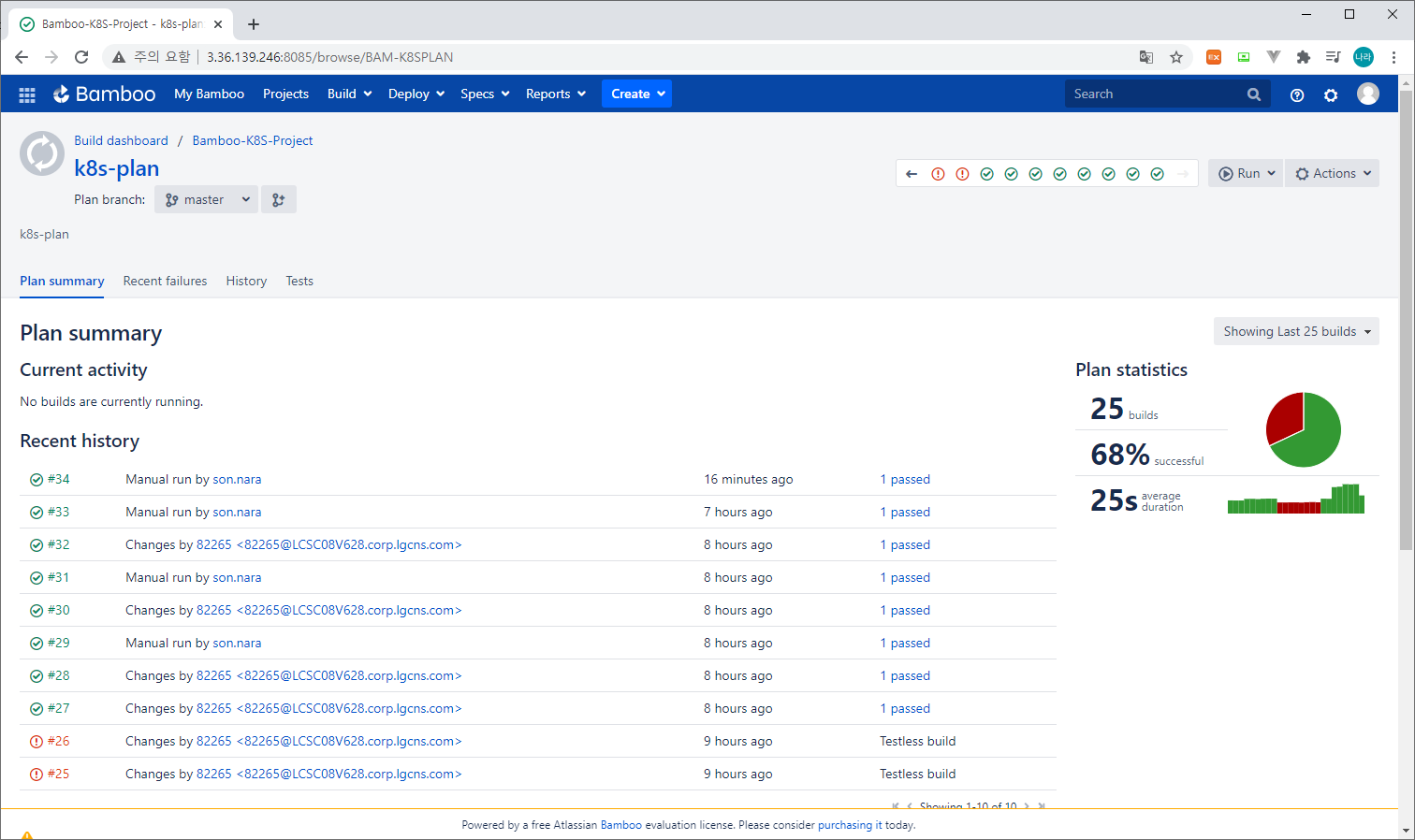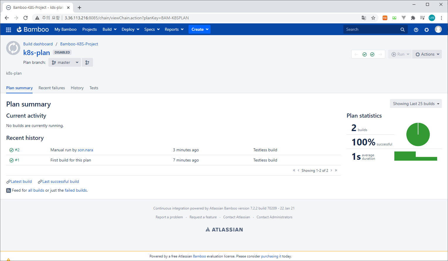 Bamboo 대시보드 홈에는 실행 가능한 Plan을 확인할 수 있다. 직접 오른쪽 Run 화살표 버튼으로 Plan을 실행하거나, 상단의 Projects → Bamboo-K8S-Project →k8s-plan으로 이동하여 오른쪽 상단의 Run 버튼으로 실행할 수도 있다.