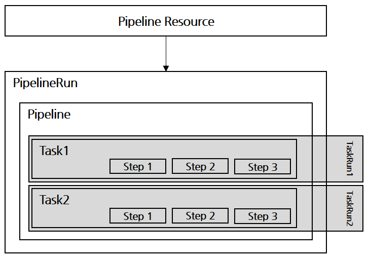 실제 논리적인 연관도를 보자면, Step > Task > Pipeline > PipelineRun으로 이어진다고 볼 수 있다. TaskRun의 경우 Task > TaskRun으로 동작한다.