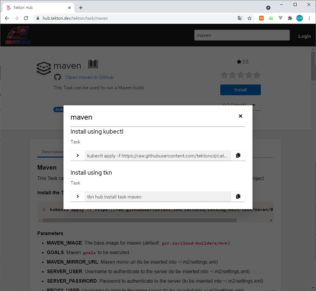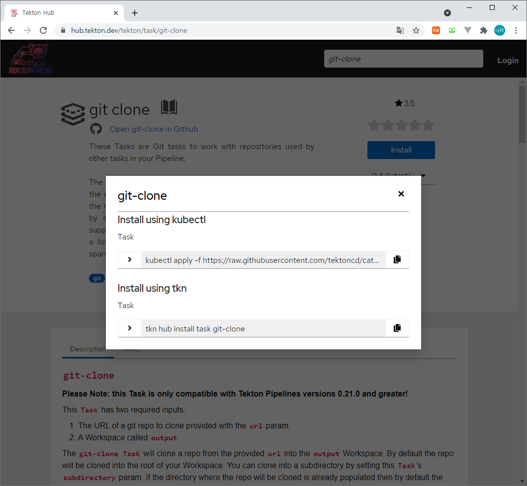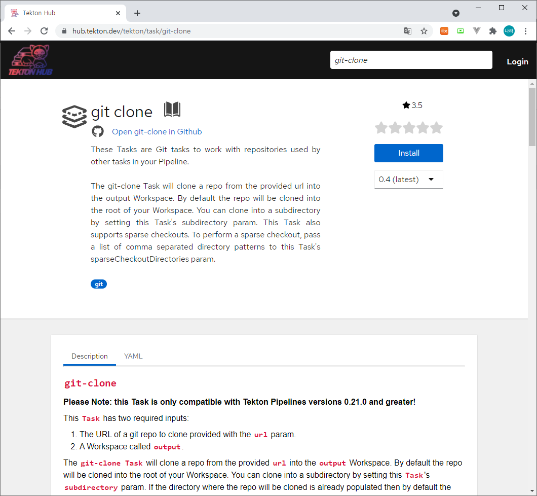 1) hub.tekton.dev 에서 git-clone task 다운로드 및 메뉴얼 확인