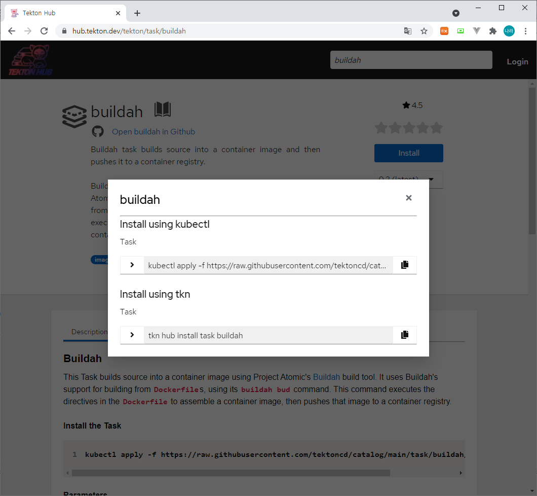 > 앞선 포스팅에서도 확인했듯이 Install 버튼을 클릭하여 기 정의되어 있는 Task Template을 Kubernetes에 적용한다.