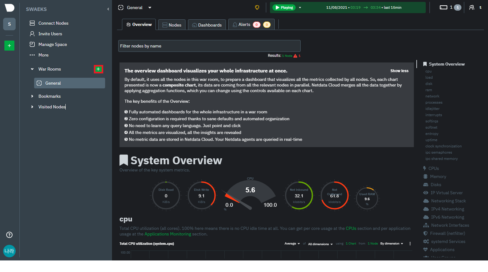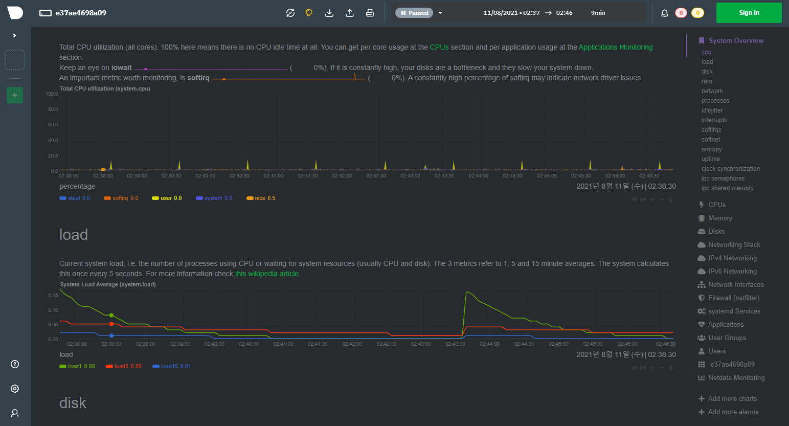 기본으로 Netdata가 설치되어 있는 서버의 메트릭 정보를 확인할 수 있다. 주요 메트릭 정보로 CPU, MEMORY, DISK, NETWORK 등의 정보를 확인할 수 있다.