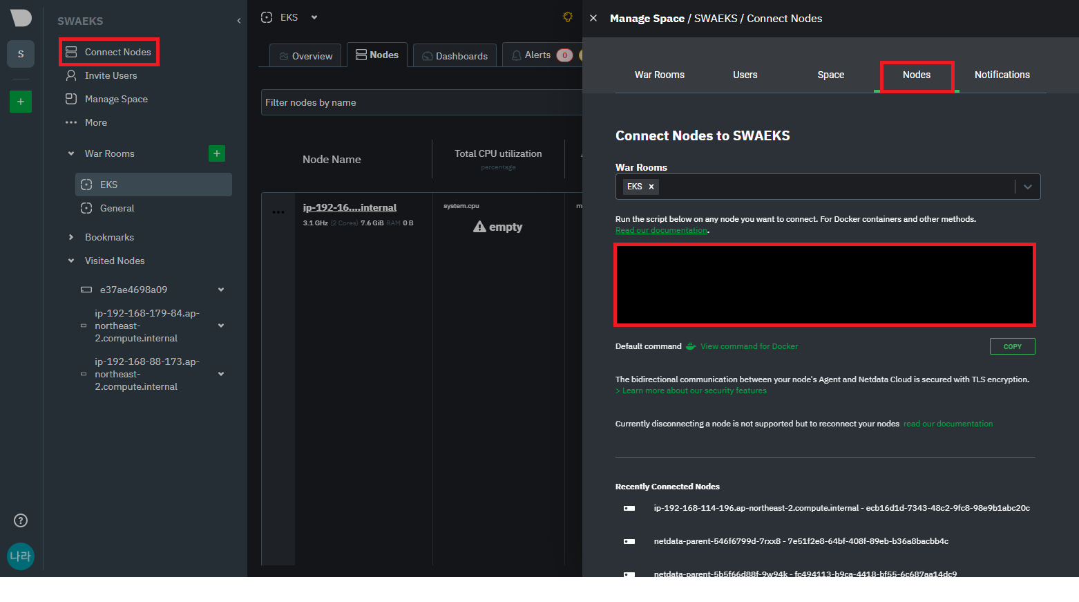 netdata parent/child 구성이 완료되면, netdata 대시보드에 연결하기 위한 claim을 요청해야 한다. claim 요청에 사용되는 TOKEN과 ROOM 번호는 위와 같이 Connect Nodes - Nodes - 빨간박스 부분에서 확인할 수 있다.