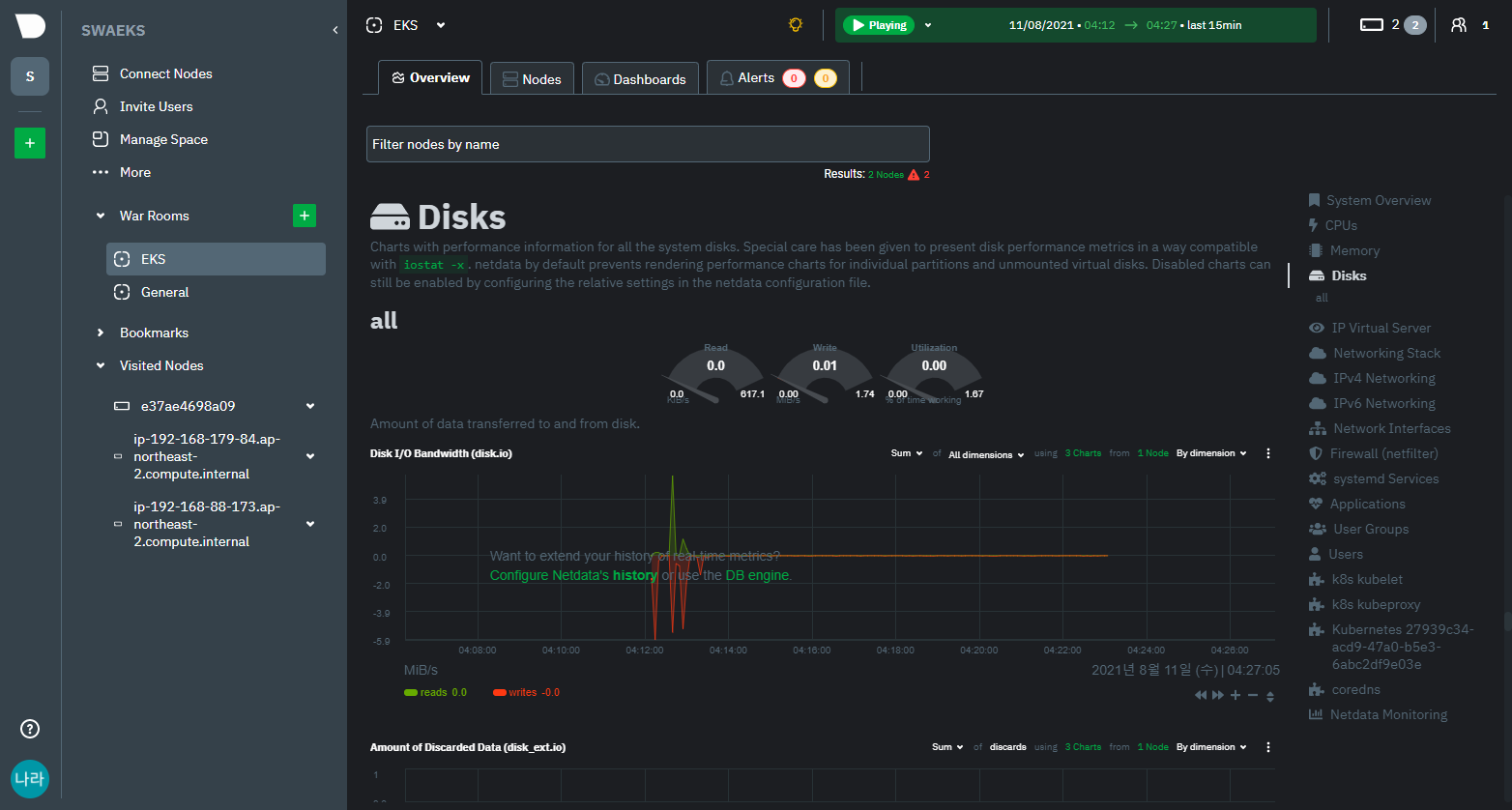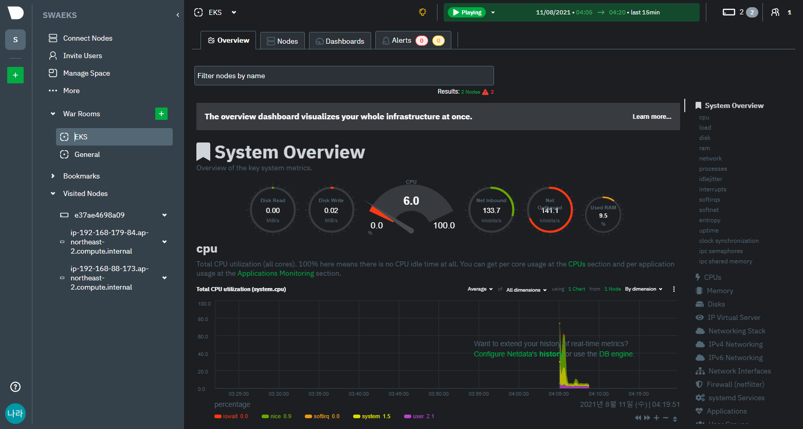 Netdata는 Kubernetes 만을 위한 오픈소스는 아니며, 모놀리스 환경의 On-Prem 또는 VM 환경의 SMS 솔루션으로도 활용 가능하다. 포스팅에서는 EKS에 접근 가능한 Workstation Server에 Netdata를 구축하고, Worker 노드와 EKS Pod를 함께 모니터링하는 과정에 대해 알아보도록 하자.