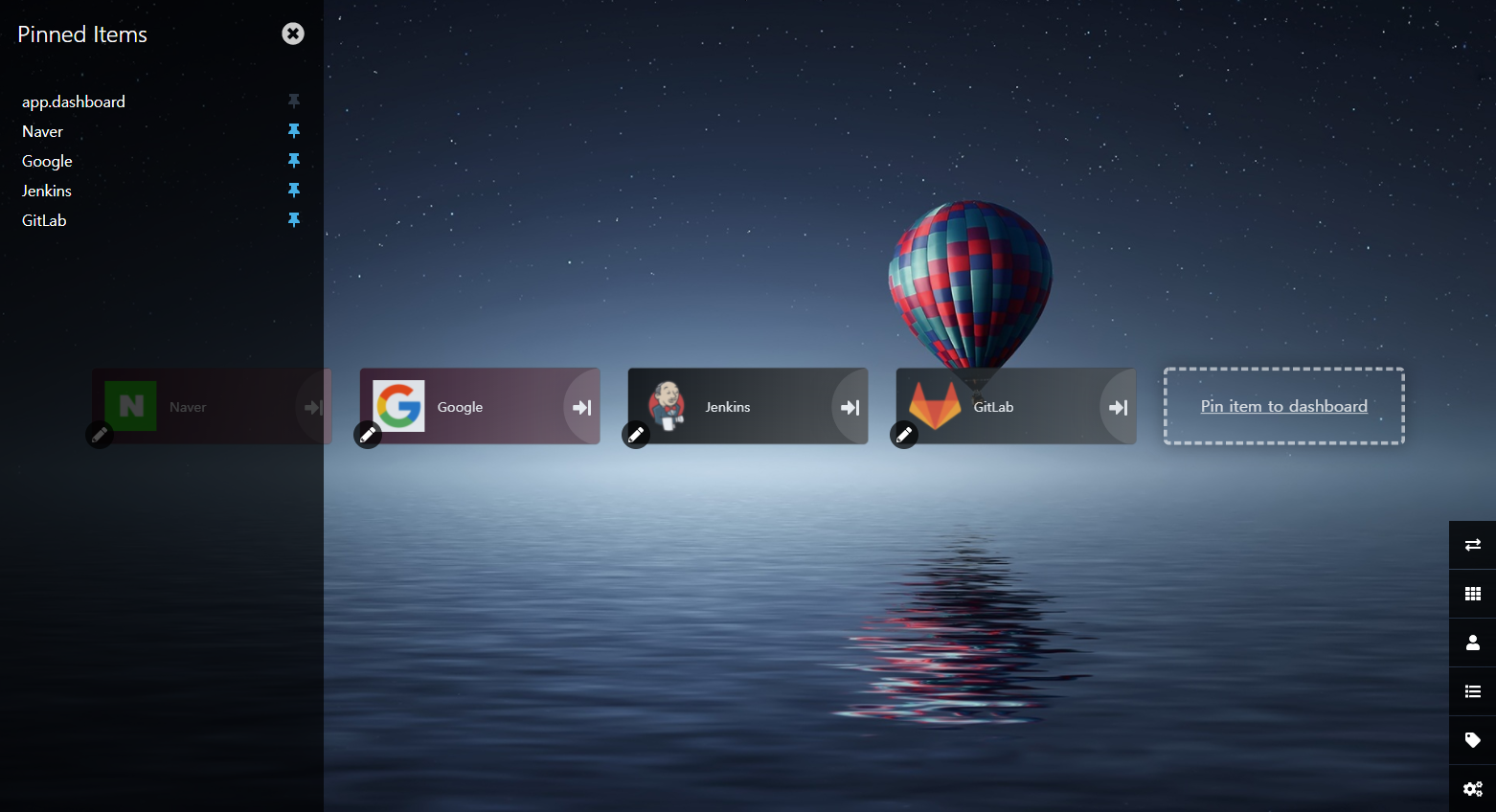 첫번째 메뉴인 Pinned Items을 선택하면, Pin item to dashboard 메뉴활성화와 추가된 Item을 드래그앤 드랍이로 편집할 수 있도록 화면이 변경된다.