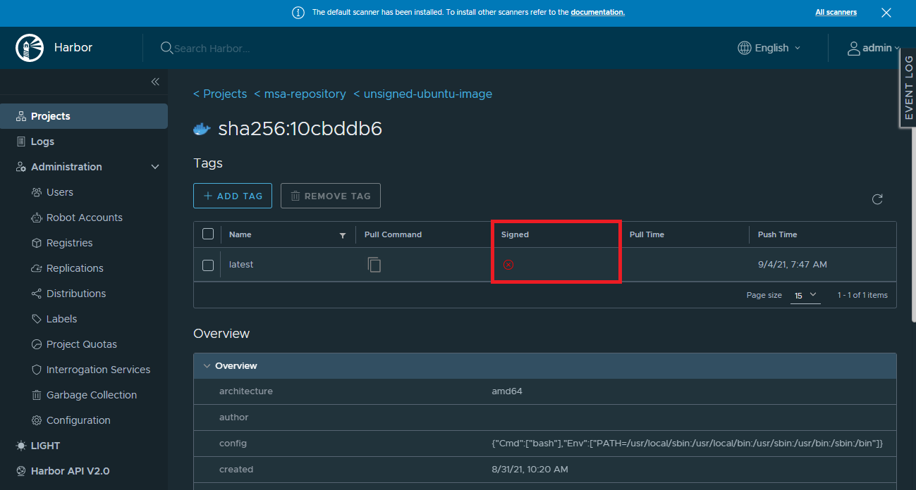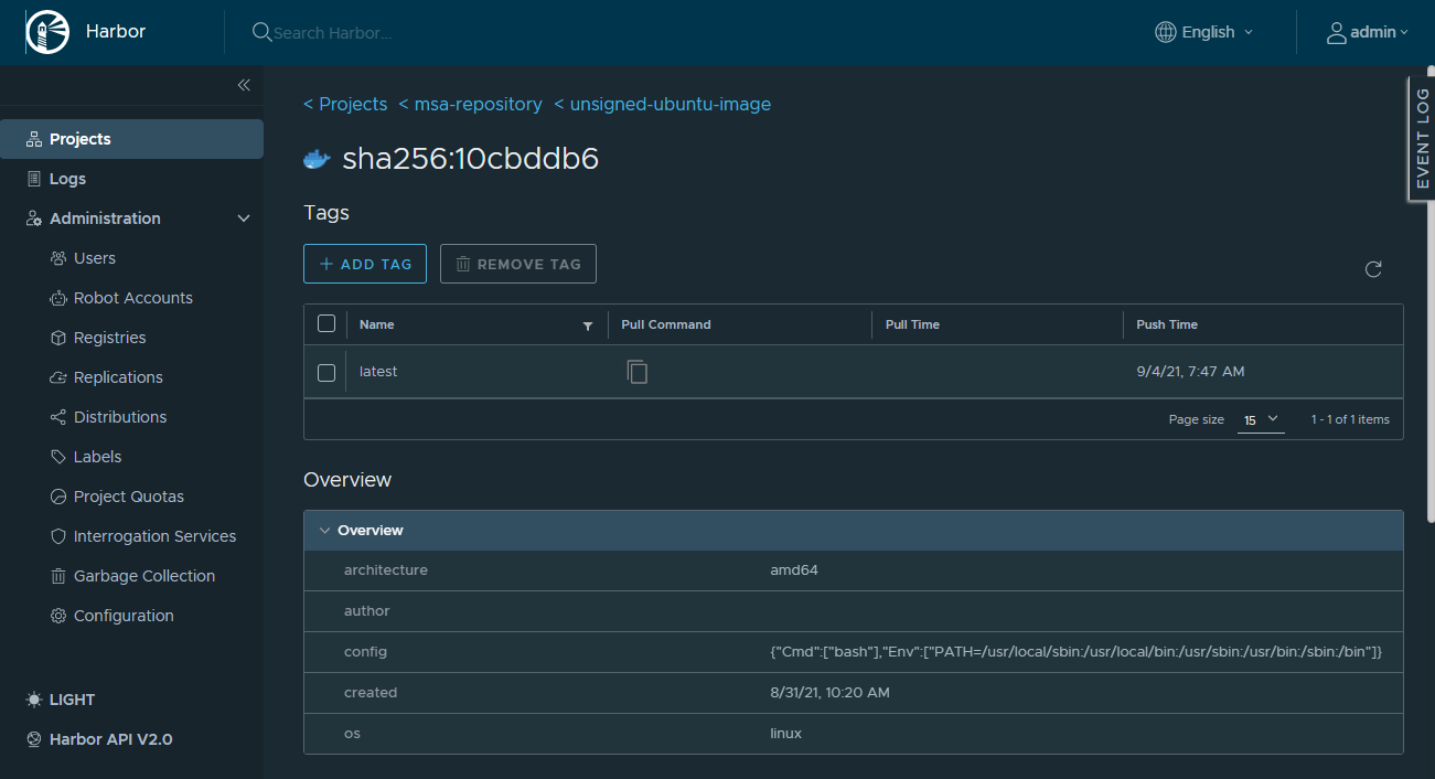 아래는 Notary가 포함되지 않은 Harbor 대시보드 이미지 정보이다.