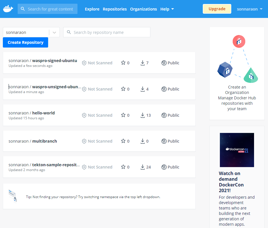 - unsigned-ubuntu:latest 이미지의 경우 "No signatures or cannot access sonnaraon/unsigned-ubuntu:latest"로 서명되지 않은 상태임을 확인할 수 있다.
