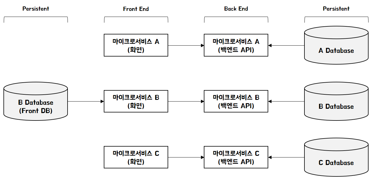 기존 모놀리식 어플리케이션이 마이크로서비스로 변화하는 과정에서 어플리케이션은 화면, 백엔드, 데이터로 세분화 된다. 대체로 MVC 구조에 익숙한 모놀리식 어플리케이션과 다르게 View 영역이 하나의 마이크로서비스로 분리되며, Persistent 영역은 마이크로서비스 별 독립된 데이터베이스로 구성된다. 때로는 화면에서 직접 조회가 가능한 데이터베이스도 존재한다.
