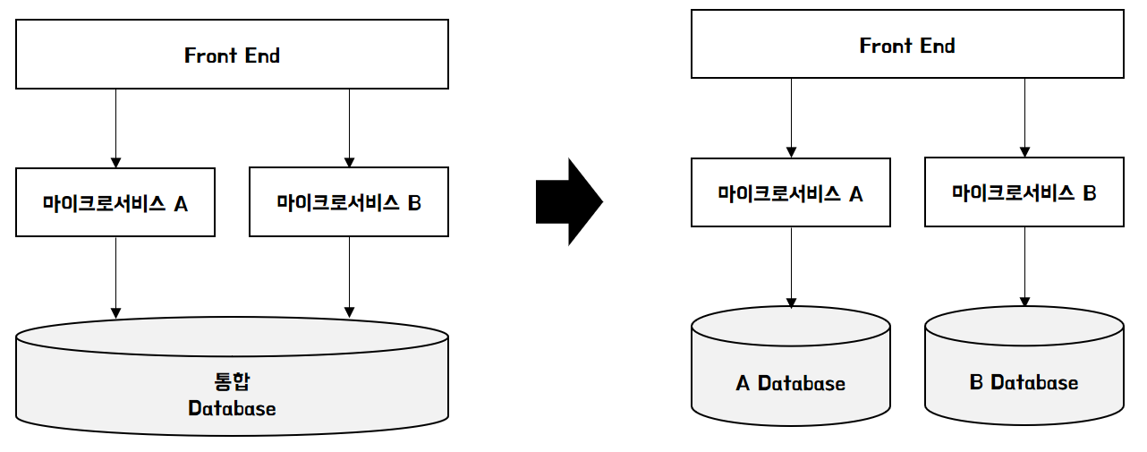 이때 마이크로서비스 전환이 시작되는 시점부터 반드시 데이터베이스를 분리해야 하는가? 라는 질문이 있을 수 있다. 결론부터 말하자면 반드시 초기부터 데이터를 구분할 필요는 없다. 물론 장기적인 관점에서 바라보았을때, 점진적 이행이 가능한 형태로 데이터베이스를 분리해 나가는 것은 중요하지만, 초기 마이크로서비스 아키텍처를 적용하여 프로젝트를 시작하는 시점에서 데이터베이스를 분리하는 것은 위험도가 굉장히 높아 질뿐 아니라, 프로젝트 실패시 부담해야할 리스크 역시 커질 수 있다.