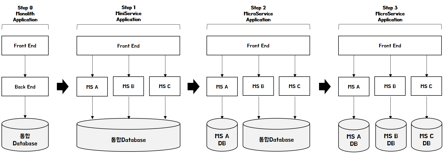 리스크를 최소화하며 마이크로서비스로 전환해 나가기위해서는 백엔드 → 데이터베이스(데이터) → 프론트엔드 순으로 점진적인 변화를 가져가는 것이 효과적이다.