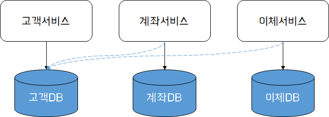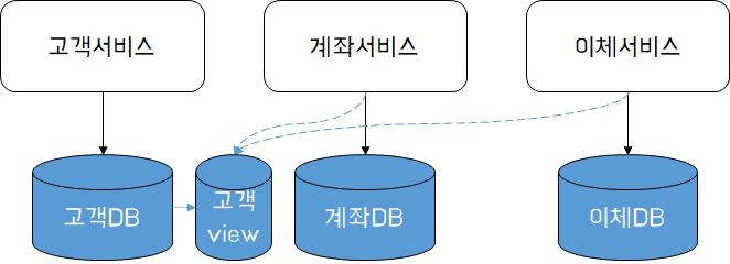 위는 타 서비스의 데이터소스에 직접 접근하는 형태의 조회 방식이다. 위와 같이 구성할 경우 공유하는 서비스간 결합도가 높아지는 문제가 발생할 수 있다. 고객 서비스의 고객 DB가 변경될 경우 계좌서비스와 이체서비스는 변경된 데이터 또는 스키마에 대한 검증을 함께 수행해야 한다.