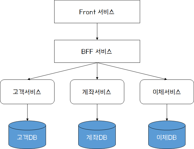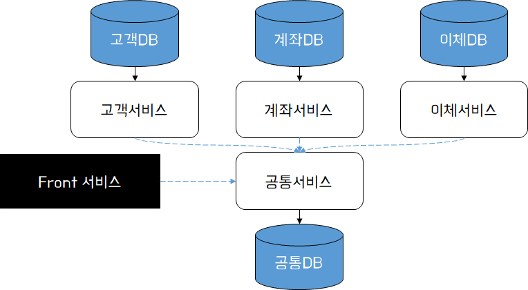 즉 고객/계좌/이체 서비스에서 개별적으로 사용하는 데이터는 각 서비스의 DB에 저장하고, 공통으로 사용하는 데이터 또는 상호 공유되어야 하는 데이터를 공통서비스 내 공통DB에 저장한다. 공통서비스는 Front 서비스에게 공통 데이터를 직접 액세서 할 수 있도록 엔드포인트를 제공하고, 마이크로서비스 간에는 공통 데이터 또는 공유 데이터를 조회할 수 있는 API를 제공한다. 고객/계좌/이체(호출자) 서비스는 DB에 직접 액세스 하지 않고 API를 호출하여 결과를 전달 받는 방식으로 구현한다.