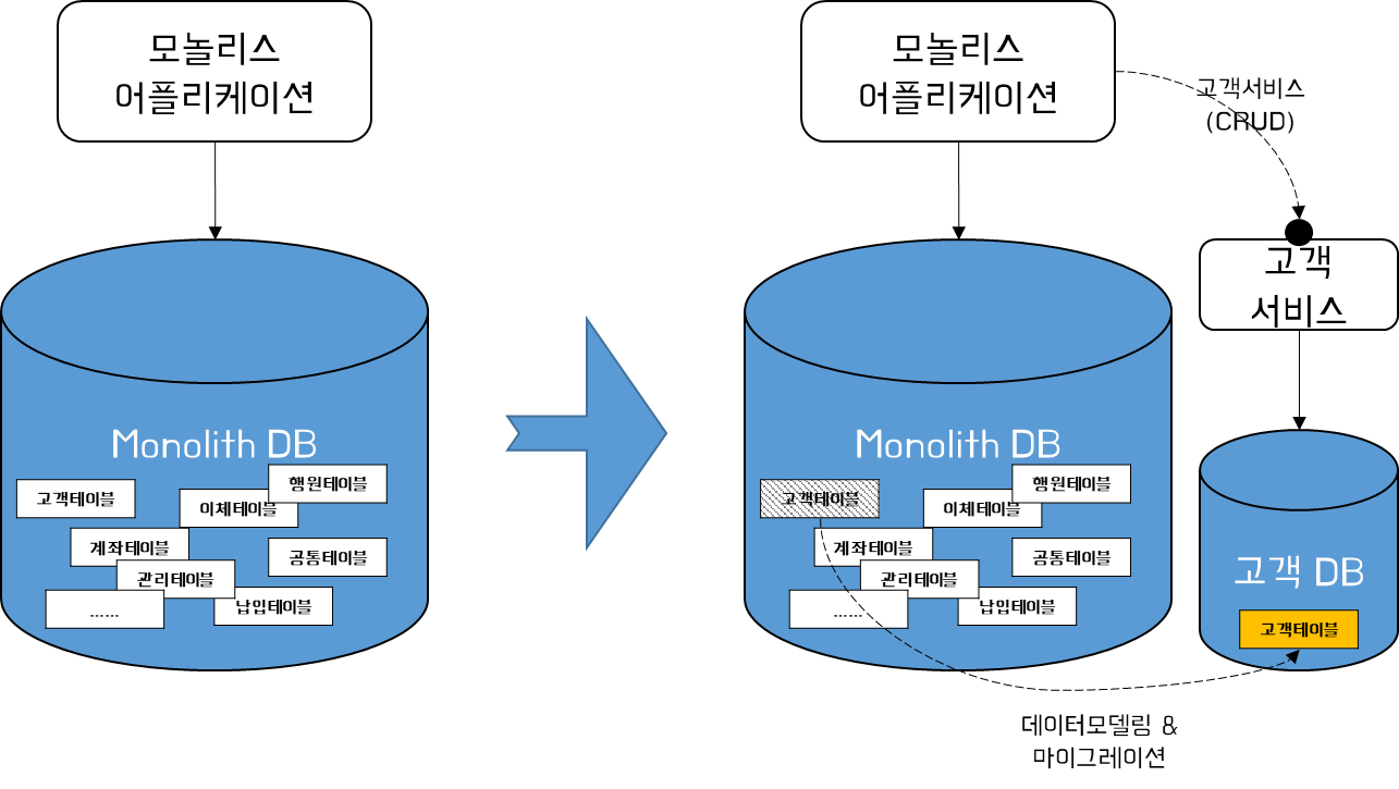 아래와 같은 경우 고객데이터를 모놀리스에서 고객DB로 으로 이동한다. 이때, 고객DB에 저장된 고객관련 테이블에 접근하고자 할 경우 모놀리스 어플리케이션은 물론 타 마이크로서비스는 고객 서비스의 API를 호출하여 데이터를 읽거나 변경 사항을 반영하도록 해야 한다.