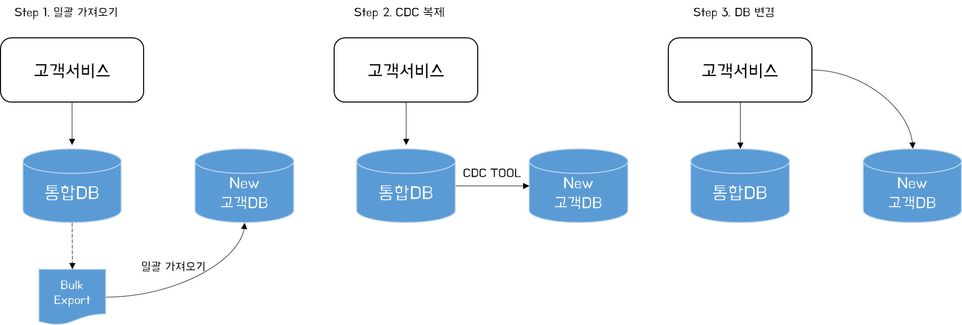 데이터 동기화를 위해 제일 먼저 수행해야 하는 것은 Source 데이터베이스에서 Target 데이터베이스로의 데이터 일괄 복제하는 것이다. 복제가 진행되는 동안 기존 시스템에 반영된 데이터로 인해 복제 완료된 Target 데이터베이스와 데이터 정합성 문제가 발생할 수 있다. 복제가 완료되면 이후 변경사항에 대해 CDC 도구를 통해 동기화할 수 있으며, 동기화가 완료되는 시점에 Target 데이터베이스를 어플리케이션 서비스에 배포할 수 있다.