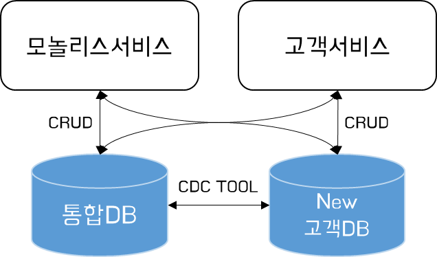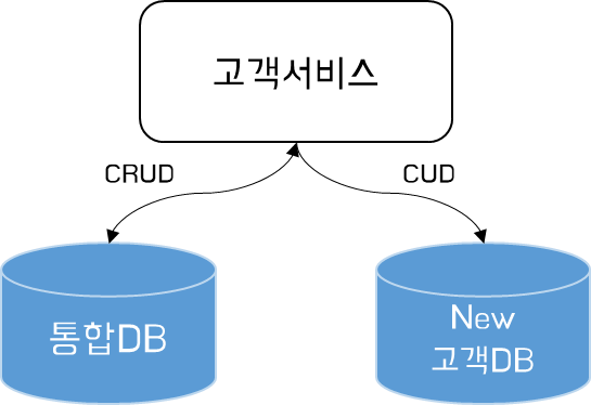 먼저 양방향 쓰기이다. 양방향 쓰기는 통합DB, New 고객DB 양쪽에 동일한 CUD를 발생시키는 방식이다.