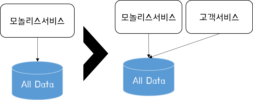 모놀리스 서비스와 고객 서비스 간 공존하는 데이터에 대해 항상 모든 데이터가 동기화 되어야 하는 것은 아니다. 모놀리스 서비스에서 사용하는 데이터 또는 타 서비스에서 사용하는 데이터에 대해 동기화 하되 신규로 서비스 되는 데이터에 대해서는 고객 서비스에 저장하는 방식이 적합하다.