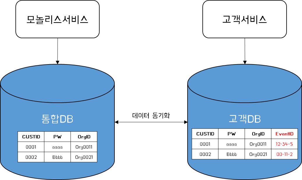 예를 들어 아래와 같이 고객 서비스의 핵심 데이터는 CUSTID, PW, OrgID로 모놀리스, 고객서비스 모두에 저장된다. EventID의 경우 신규로 추가된 서비스로 고객서비스에 저장된다.