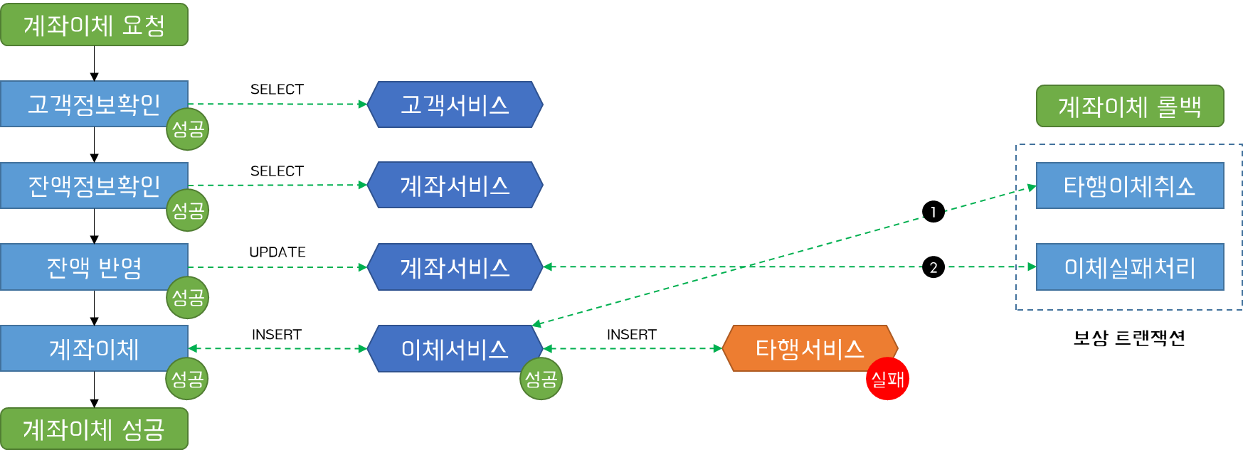 이 모든 단계가 단일 데이터베이스 트랜잭션에서 수행된 경우 간단한 롤백으로 정리할 수 있었을 것이다. 그러나 이체서비스, 타행서비스, 계좌서비스 서로 다른 세 서비스에서 상호간의 호출에 의해 처리 되었기 때문에 일괄 롤백으로 처리할 수는 없다. 대신 롤백을 구현하려면 보상 트랜잭션을 구현해야 한다. (보상 트랜잭션은 이전에 커밋 된 트랜잭션을 취소하는 작업)