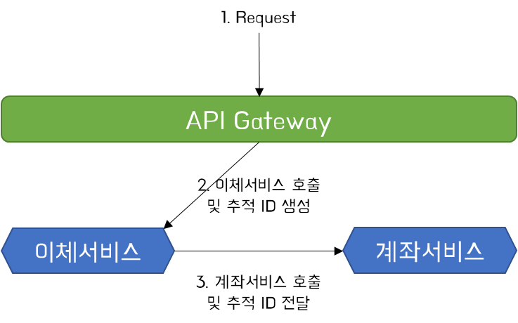 이체 서비스가 요청을 받으면 최초 받은 요청을 받은 서비스에서 추적 ID를 생성한다. 계좌 서비스를 호출할때 생성한 추적 ID를 함께 전달한다. 이는 HTTP 헤더, 메시지 페이로드의 필드 또는 기타 메커니즘을 통해 수행될 수 있다. 일반적으로 초기 첫 마이크로서비스가 호출될 때 생성되는 추적 ID는 서비스 자체적으로 판단하여 생성할 수도 있지만, API 게이트웨이 또는 서비스 메시를 통해 생성되는 것이 일반적이다.