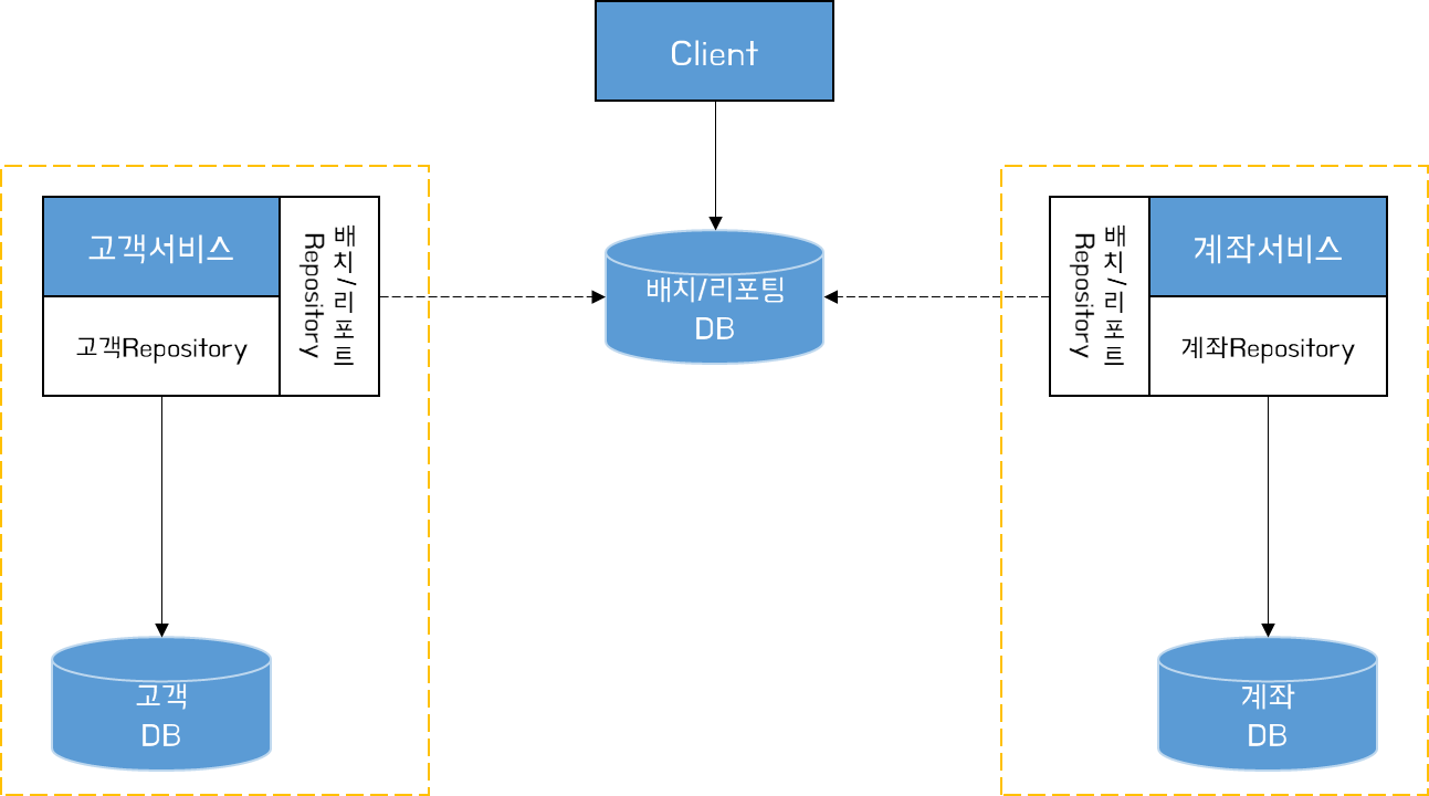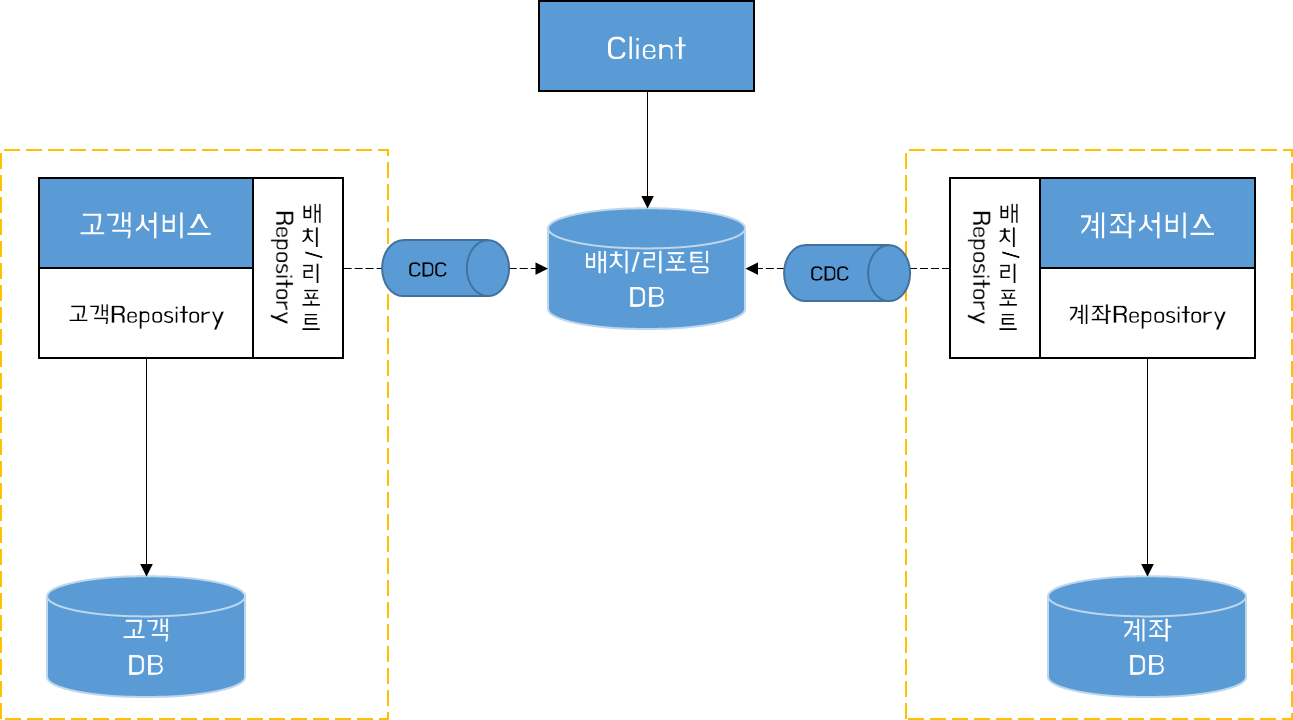 마이크로서비스 아키텍처를 통해 우리는 이 모놀리식 스키마를 분해하여 데이터 독립성을 유지하는 반면, 데이터 전반에 걸친 대규모 조인 작업과 관련되어 데이터를 제공하기 위한 ReadOnly 복제본을 제공하기도 한다. 그럼에도 불구하고 단일 DB를 사용하던 과거와 다르게 데이터가 논리적으로 격리된 여러 스키마에 분산되어 있으므로 이를 구현하는 것은 굉장히 어려운 일이다. 대표적으로 분산 데이터를 통합하여 조회하는 경우의 예를 들자면, 배치/리포팅을 들 수 있다. 배치/리포팅의 경우 여러 데이터베이스에 분리되어 있는 데이터를 조합해야 할 필요가 있다. 아래는 독립적으로 서비스하는 각 서비스 별 소유권을 갖는 DB와 배치/리포트를 처리하는 DB에 각각 Pooling하며, 서로 다른 비즈니스를 처리하는 방식이다. 이를 통해 배치/리포트 사용자의 특정 요구 사항을 염두에 두고 데이터베이스를 변경할 수 있다.