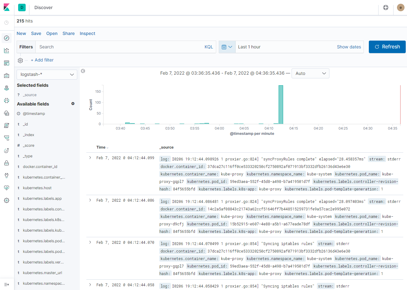 위와 같이 기존 default namespace 내의 pod와 app-test에 추가된 nginx pod만 index pattern에 추가된 것을 확인할 수 있다. kube-logging에 추가된 nginx pod는 수집 대상에서 제외되었다.