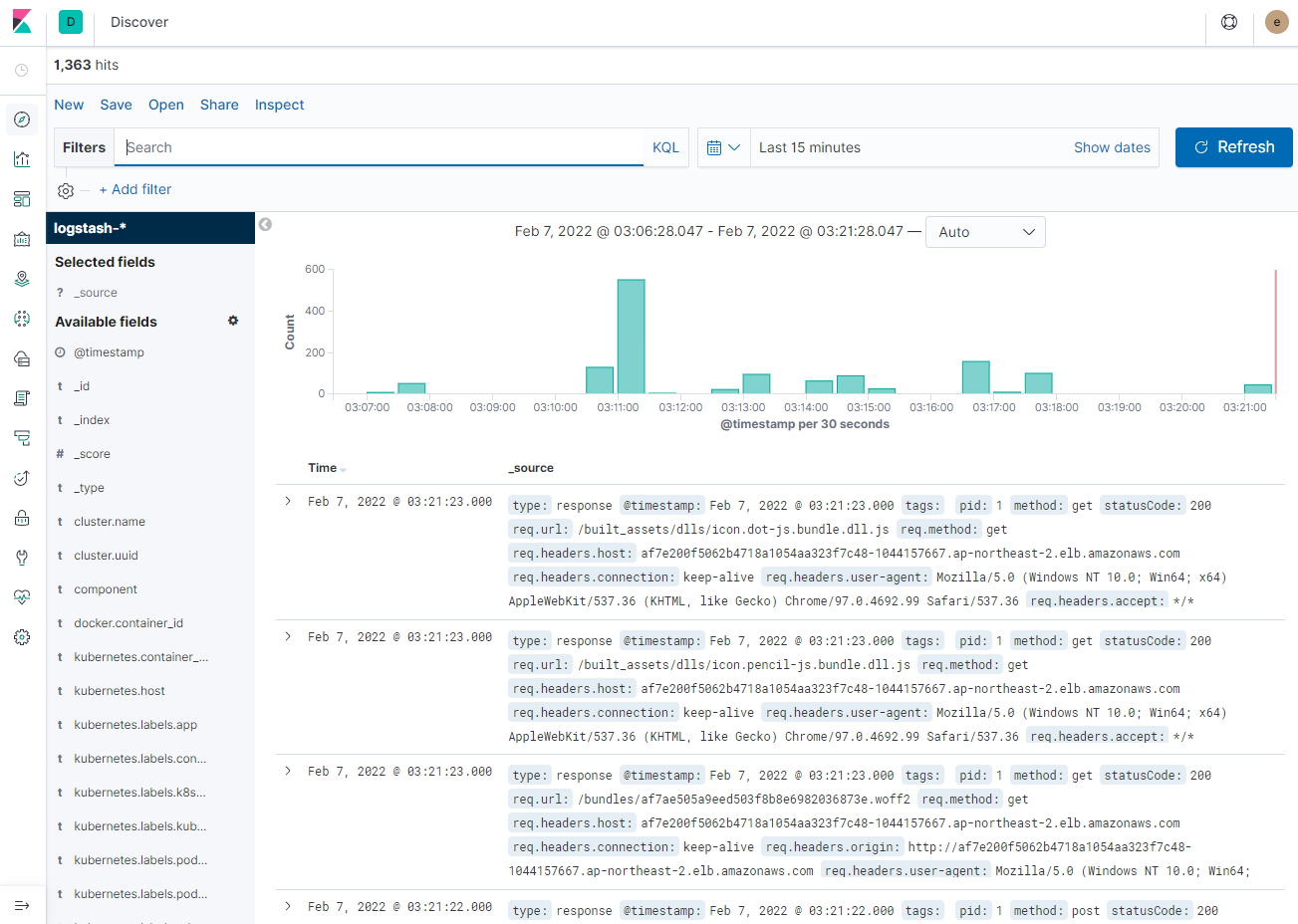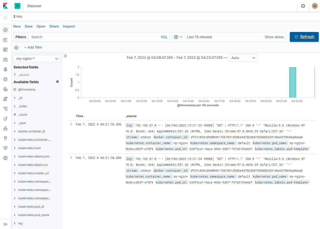 위와 같이 index pattern에 logstash 이외에 pod_name으로 기동되는 my-nginx-* pod가 추가되었다. index를 추가하고 Discover에서 아래와 같이 확인이 가능하다.