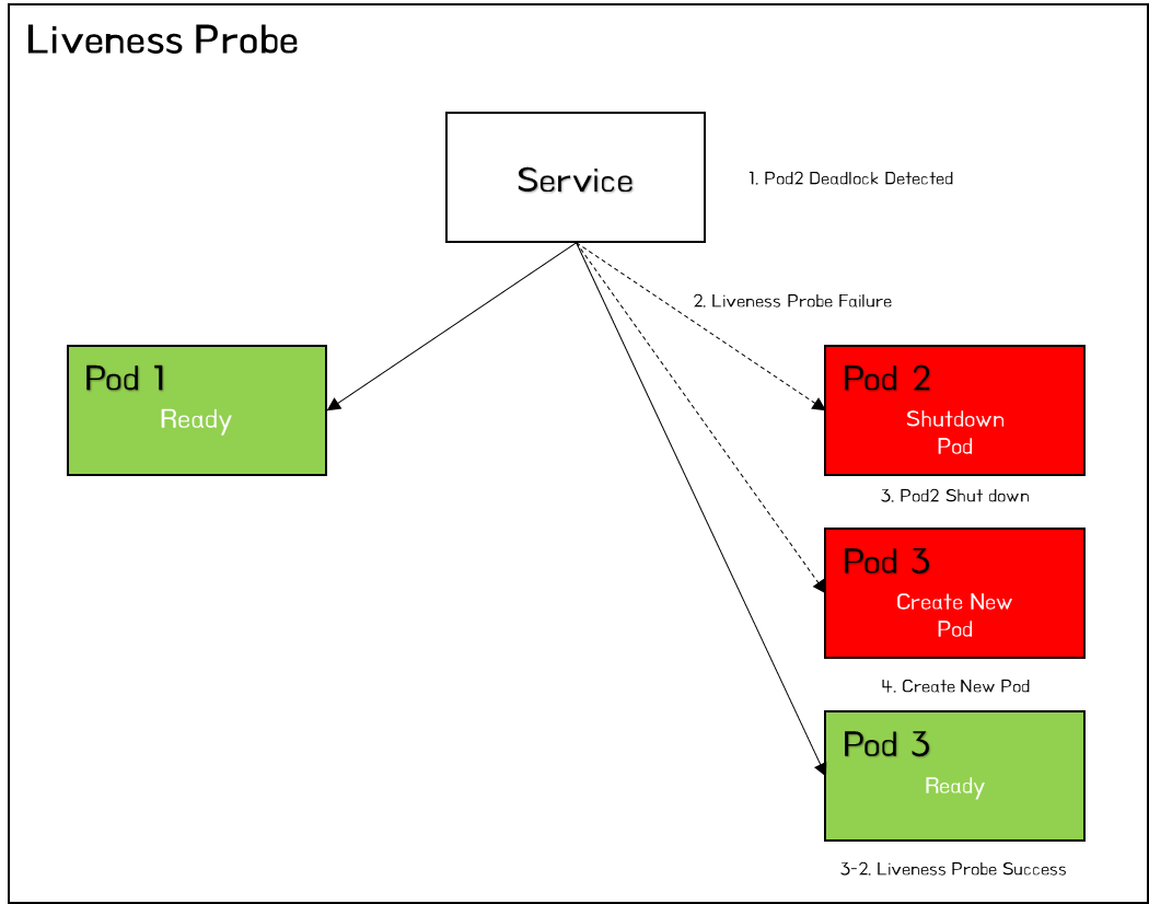 Liveness Probe를 통해 컨테이너를 언제 재시작해야 하는지 판단할수 있다. 예를 들어 container가 알 수 없는 원인으로 비정상 동작을 하거나, 교착상태에 빠졌을 경우 Liveness Probe를 통해 해당 Container를 재시작하고 일정 횟수 이상 실패할 경우 새로운 Pod로 교체한다.
