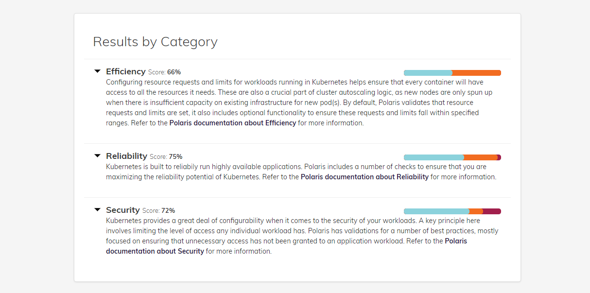 - Efficiency(효율성) : Kubernetes에서 실행되는 워크로드에 대한 Resource 확인. Resource Request 및 Limit이 설정되어 있는지 여부와 지정된 범위 내에 구성되어 있는지 확인.