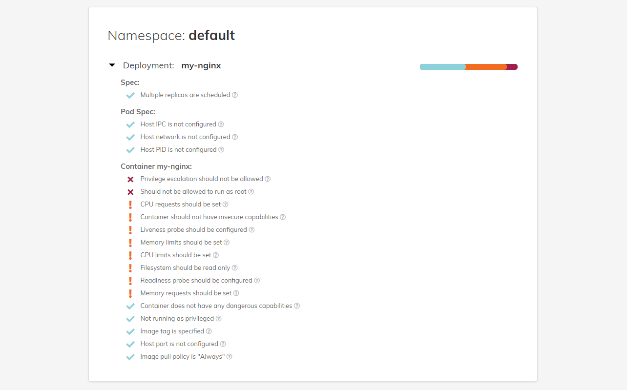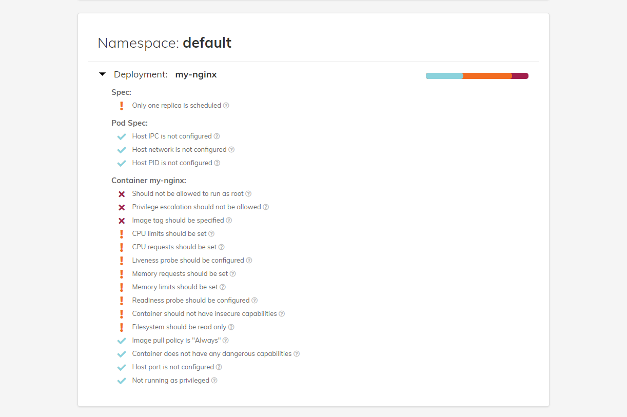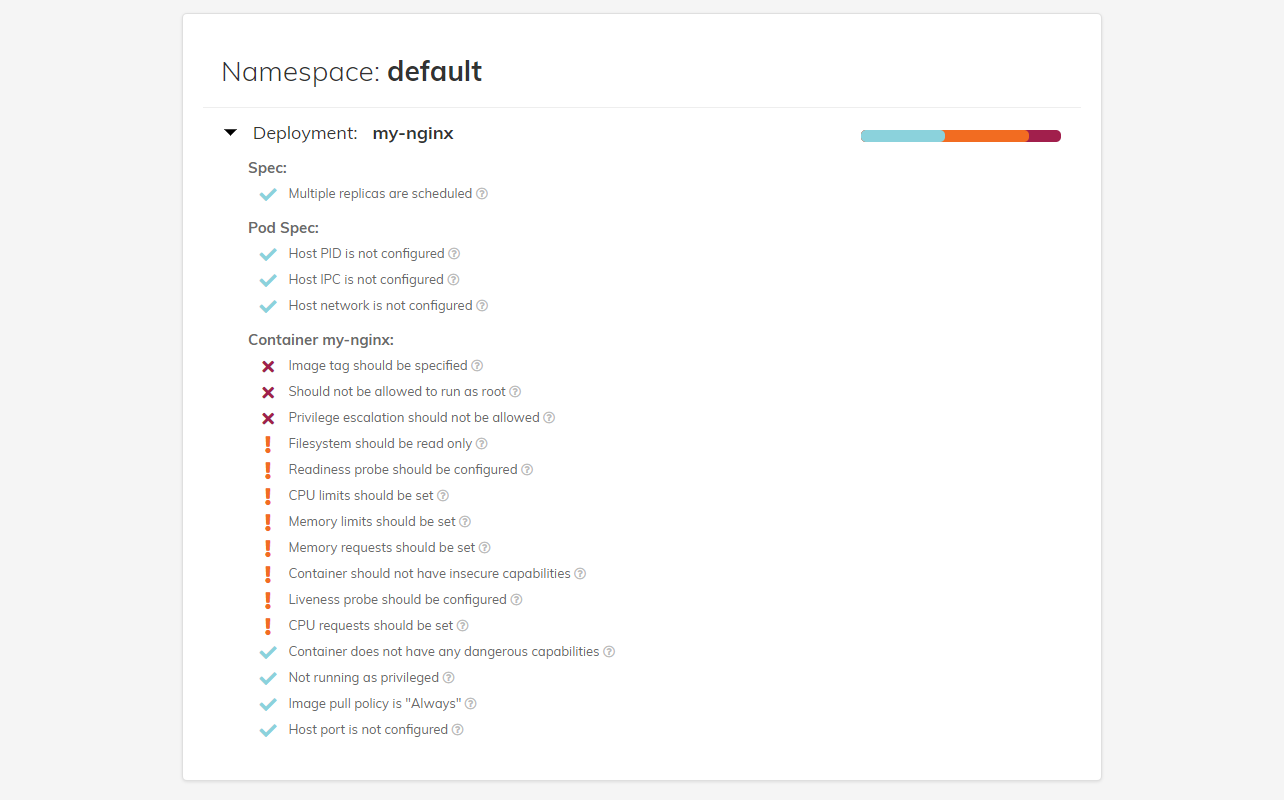 [root@ip-192-168-84-159 minikube]# polaris audit --audit-path /root/minikube/deployment.yaml --set-exit-code-below-score 90 --only-show-failed-tests true --format=pretty