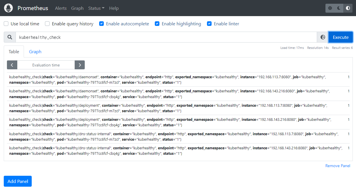 Prometheus Graph 탭에서 graph를 생성하기 위한 데이터가 조회되는지 확인한다. 위와 같이 kuberhealthy_check > Excute 클릭 시 아래와 같이 결과가 표출될 경우 정상적으로 kuberhealthy와 prometheus의 연동은 완료된다.