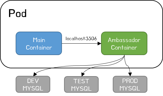 예를 들어 DB URL이 애플리케이션 내부에 localhost로 하드코딩된 레거시 어플리케이션이 있다고 가정하자. 이때 레거시 어플리케이션 코드 변경 없이 Kubernetes에 배포하고자 할 경우 Ambassador 패턴을 사용하면 코드 변경 없이 적용할 수 있다. Ambassador Container를 적용하면, Dev, QA 또는 Stage 환경에 따라 변경되는 DB URL을 수정하지 않고도 원하는 데이터베이스에 연결할 수 있다.